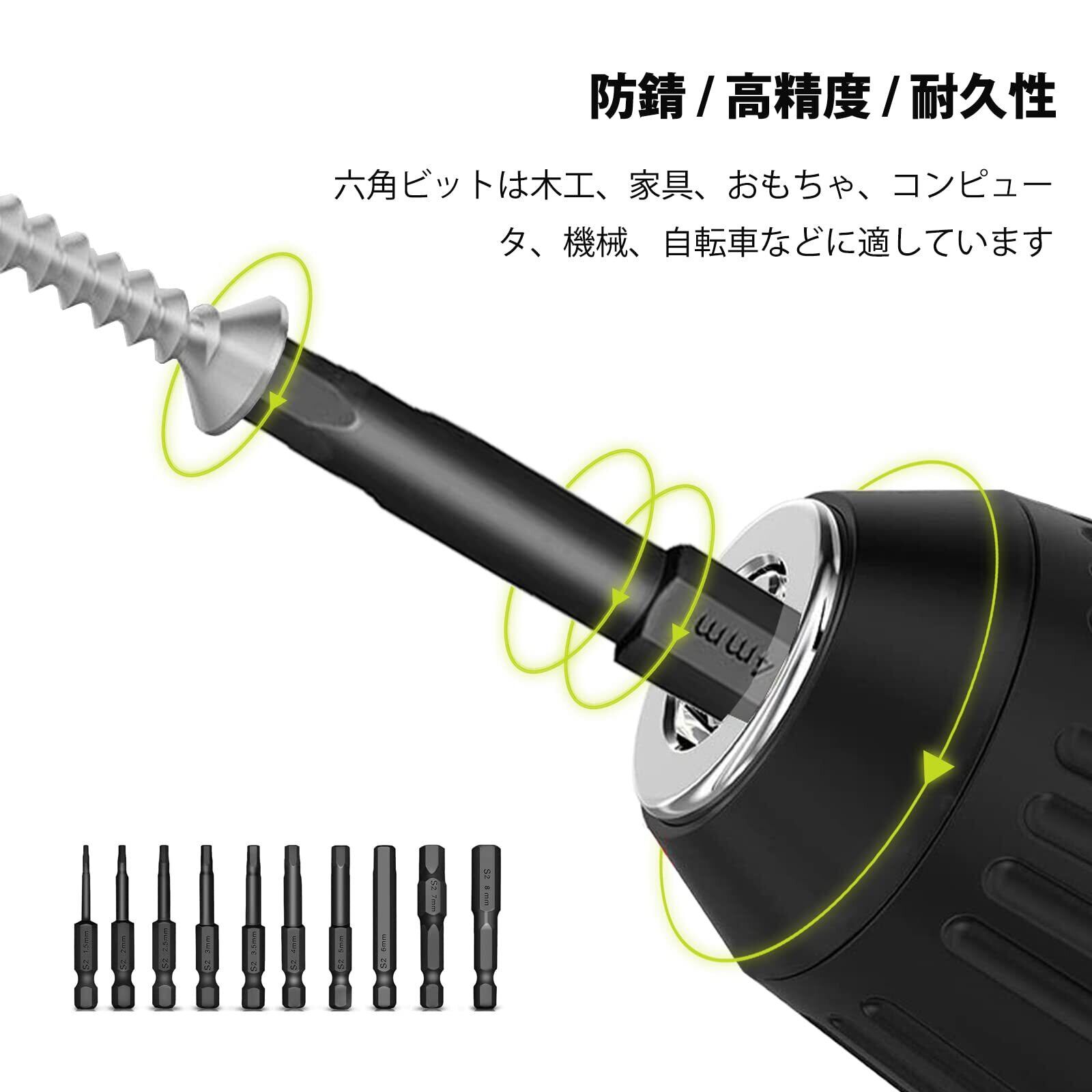 この六角ビットは家具、家電、木工、おもちゃ、コンピュータ、機械、自転車、車両整備、電設工事関連、工場内作業などに適しています。