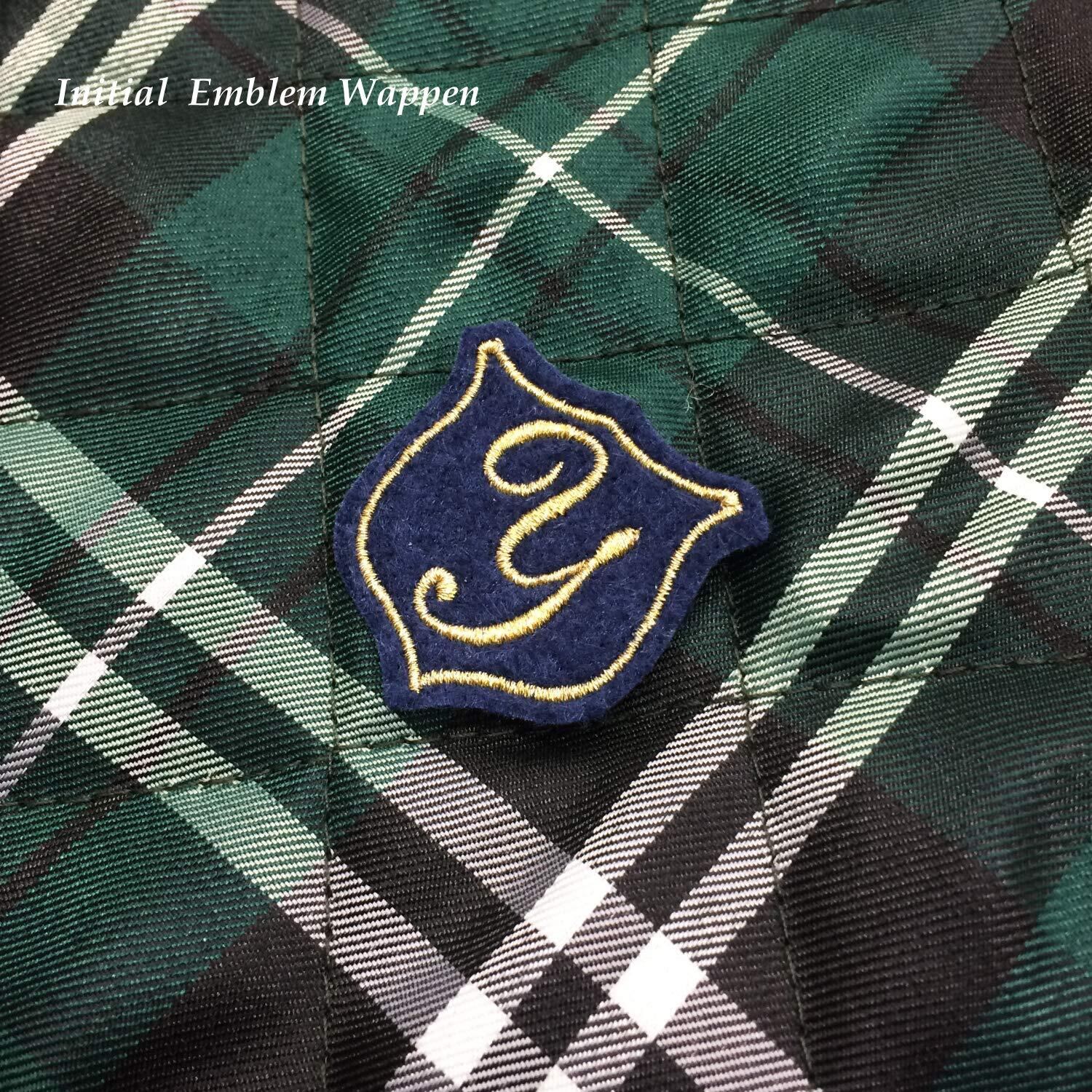 チェックやボーダー柄に合わせてもおしゃれな金糸を用いたエンブレム調のイニシャルワッペン。