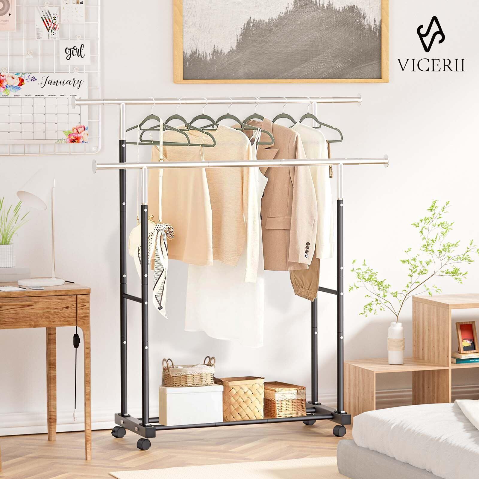 VICERII ハンガーラック おしゃれ シングルハンガーラック 室内物干し 頑丈 洋服収納 ポールハンガー スチールラック 洋服掛け キャスター付き 組立簡単 幅141×奥行43.5×高さ160CM 耐荷重45㎏ (ブラック, ダブル)