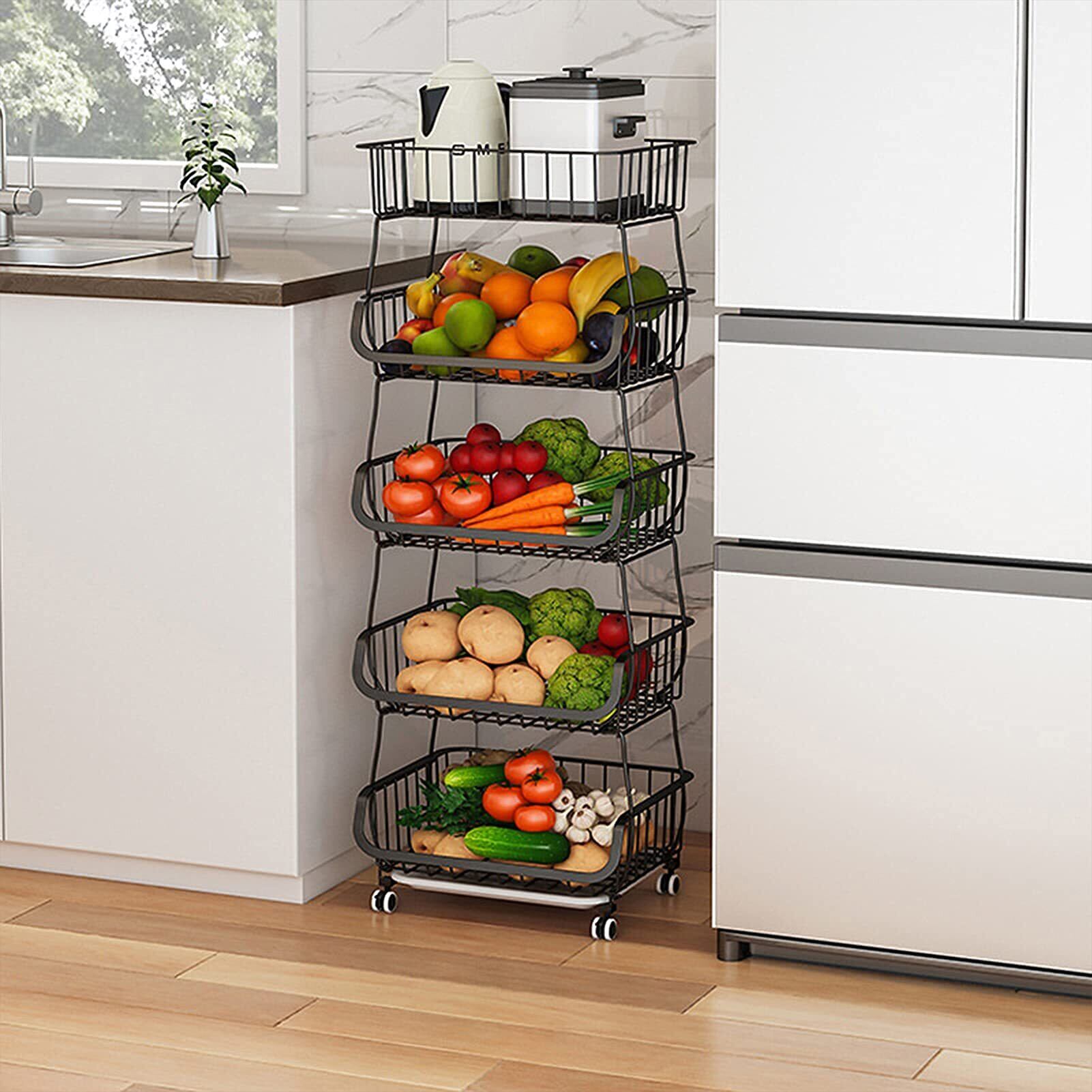 BQKOZFIN スタッキングバスケット キッチンワゴン 収納カート 5段 ワイヤーバスケット 果物と野菜の保管 多機能収納バスケット キャスターとパッド付き ブラック