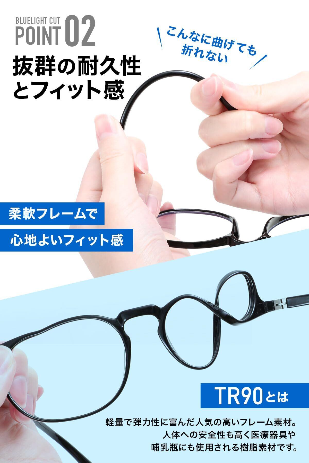 【超軽量フレームTR90】軽量で弾力性に富んだ人気のフレーム素材の一つであるTR90を採用しました。 メガネをかけているのを忘れてしまうくらいの掛け心地と、顔の形・幅に合わせてしなやかに優しくフィットするので、頭部への締め付けを与えずで長時間の着用でもストレスフリー。