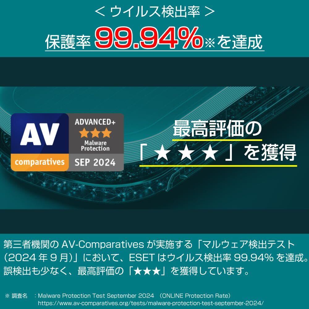 対応OS: [Windows]10/11 ※Enterprise、RT、Mobile未対応 [Mac]12~15.x(macOS Sequoia) [Android]8.0~15.0[必須事項]インターネット接続環境 / メールアドレス(携帯電話・PHS・利用期間が限定された一部のメールアドレスはご利用いただけません。)ESET(イーセット)は、「軽快な動作」と「高い検出力」を兼ね備えたセキュリティソフトです。アンチウイルス業界で最も権威のある研究機関Virus Bulletinが公開する「ウイルス検出率100% AWARD」を通算100回以上受賞。