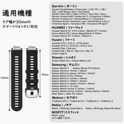 「ラグ20mm機種に対応」ラグ幅が20mmであり、ラグ取付仕様は画像表示と同じく、クイックリリース仕様のスマートウォッチに対応できる汎用替えバンドとなります。ガーミンForerunner(ForeAthlete)165/55/158/245/245Music/645、Venu Sq2/Sq、Vivoactive5/Vivoactive3、Approach S42/S40/S12、Galaxy Watch7/WatchFE/Watch6/Watch6classic/Watch5、HuaweiWatch GT3、HonorWatchES、AmazfitGTSなどに適用できます。※ガーミンFenixシリーズに対応できません。機種をしっかりとご確認されてからご購入ください。記載していない機種に適用可否かお気軽にお問い合わせください。