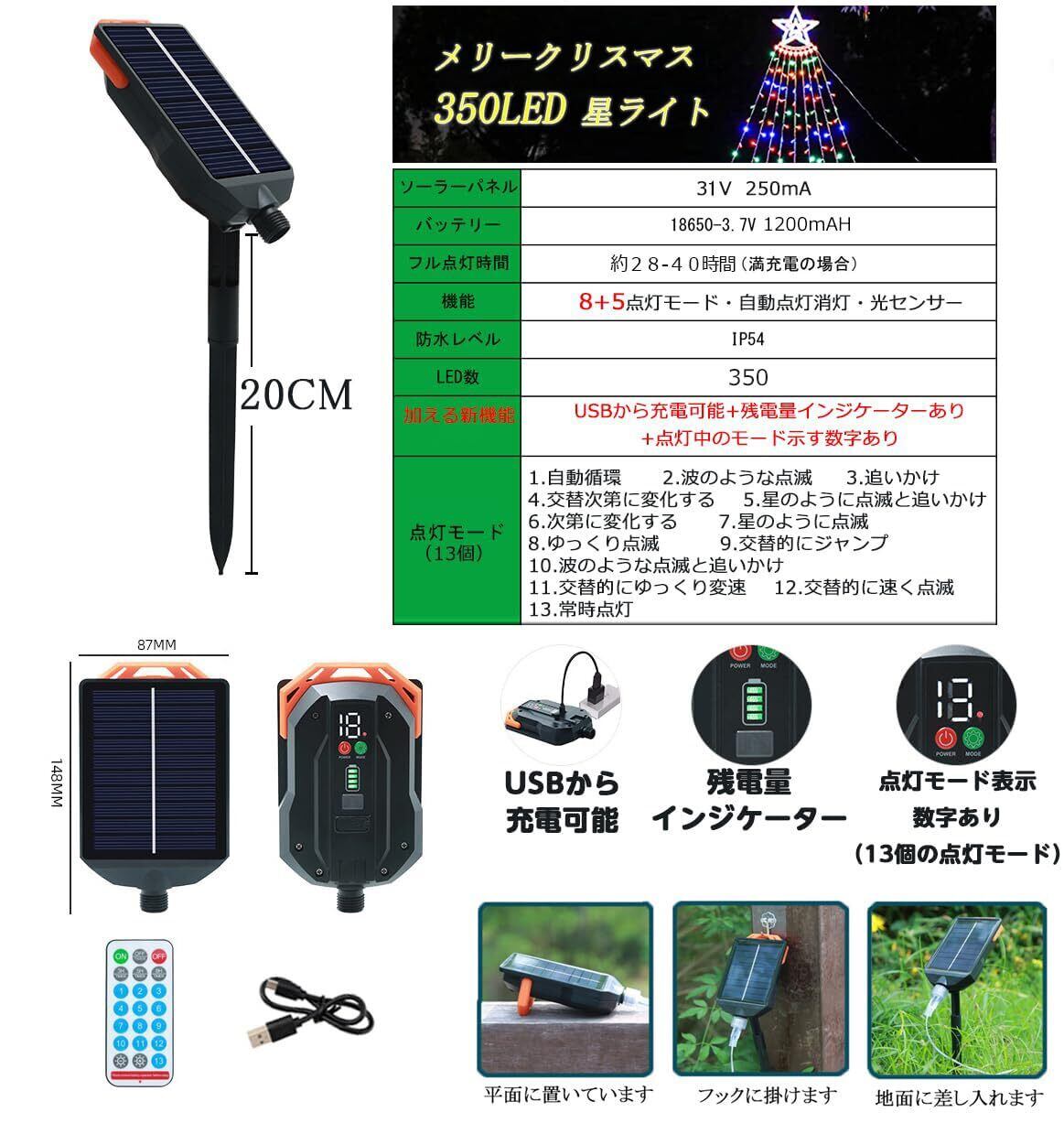 【トップ星クリスマス イルミネーション商品仕様】主な材質:PVC+銅線+ABS 【電源】ソーラーパネル中の充電池(1200mAH) 【点灯パターン】13種類の点灯パタン 【タイマー】3/5/8時間タイマーあり【記憶機能】メモリー機能付き 【充電方法】ソーラーとUSB2種類の充電方法 【制御】リモコン遠隔制御あるいはソーラーパネル後ろのボタン制御 【特徴】光センサー、昼自動消灯充電夜自動点灯;残電量インジケータあり
