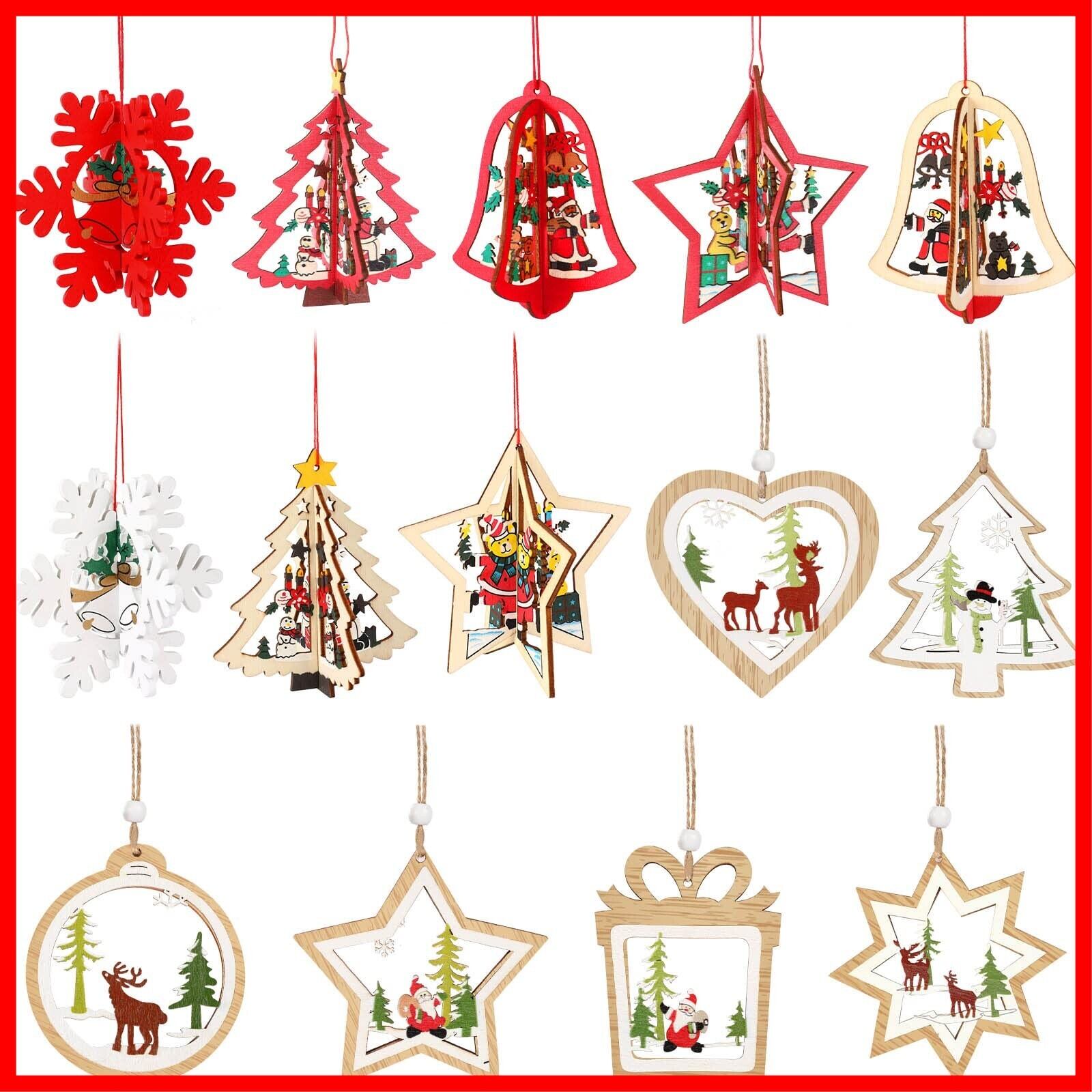 JANLOFO 14個セット クリスマスツリー オーナメント 木製 クリスマスツリー 飾り 北欧 デコレーション 立体 透かし彫り 星 雪 サンタ 雪だるま ハート ベル