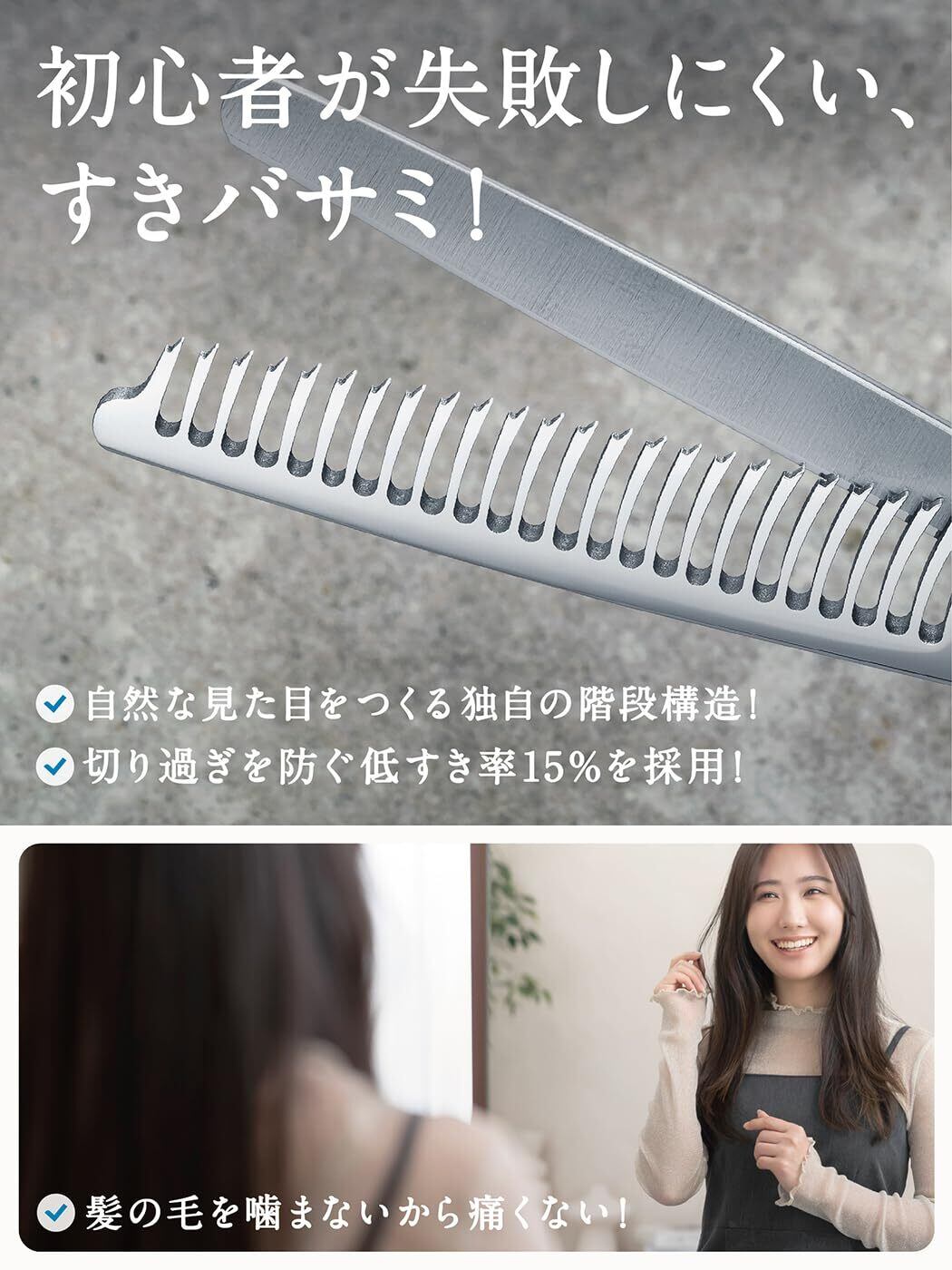 【商品仕様】一般的なすきバサミはすき率25%以上ですが、こちらはすき率15%。すき率を抑える事によって、切りすぎることなく初心者の方でも失敗するリスクを抑え、自然に仕上げることができます。