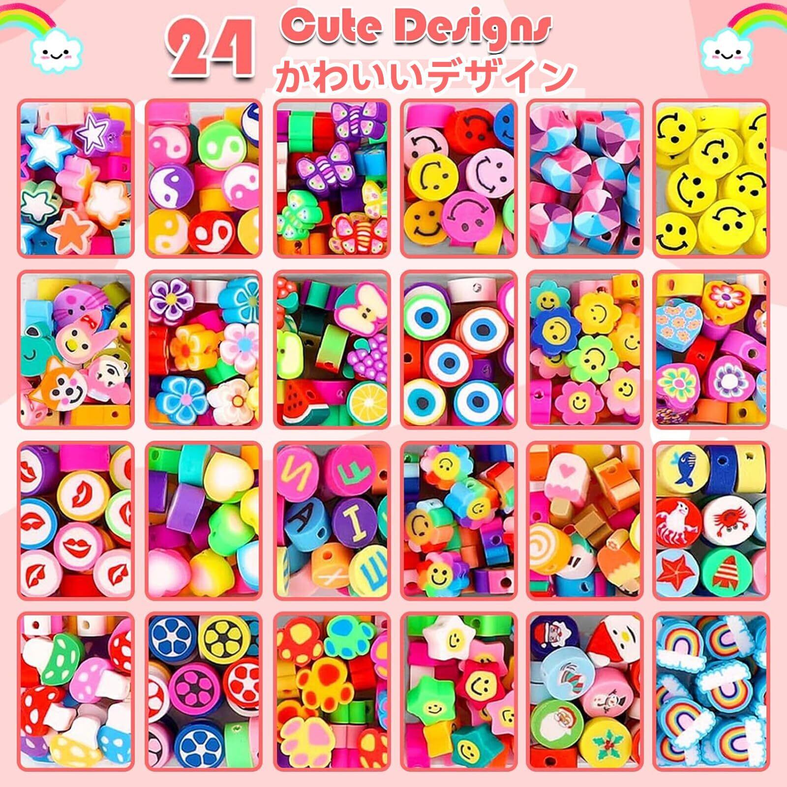 【豊富なスタイルと鮮やかな色】24種類のスタイルのビーズには、果物、動物、ハート、星、キャンディー、文字、虹、キノコ、花、サッカー、海、クリスマス、小さなカラフルなサークルが含まれており、素敵なジュエリー製品を作るための多種多様なものを提供しています。