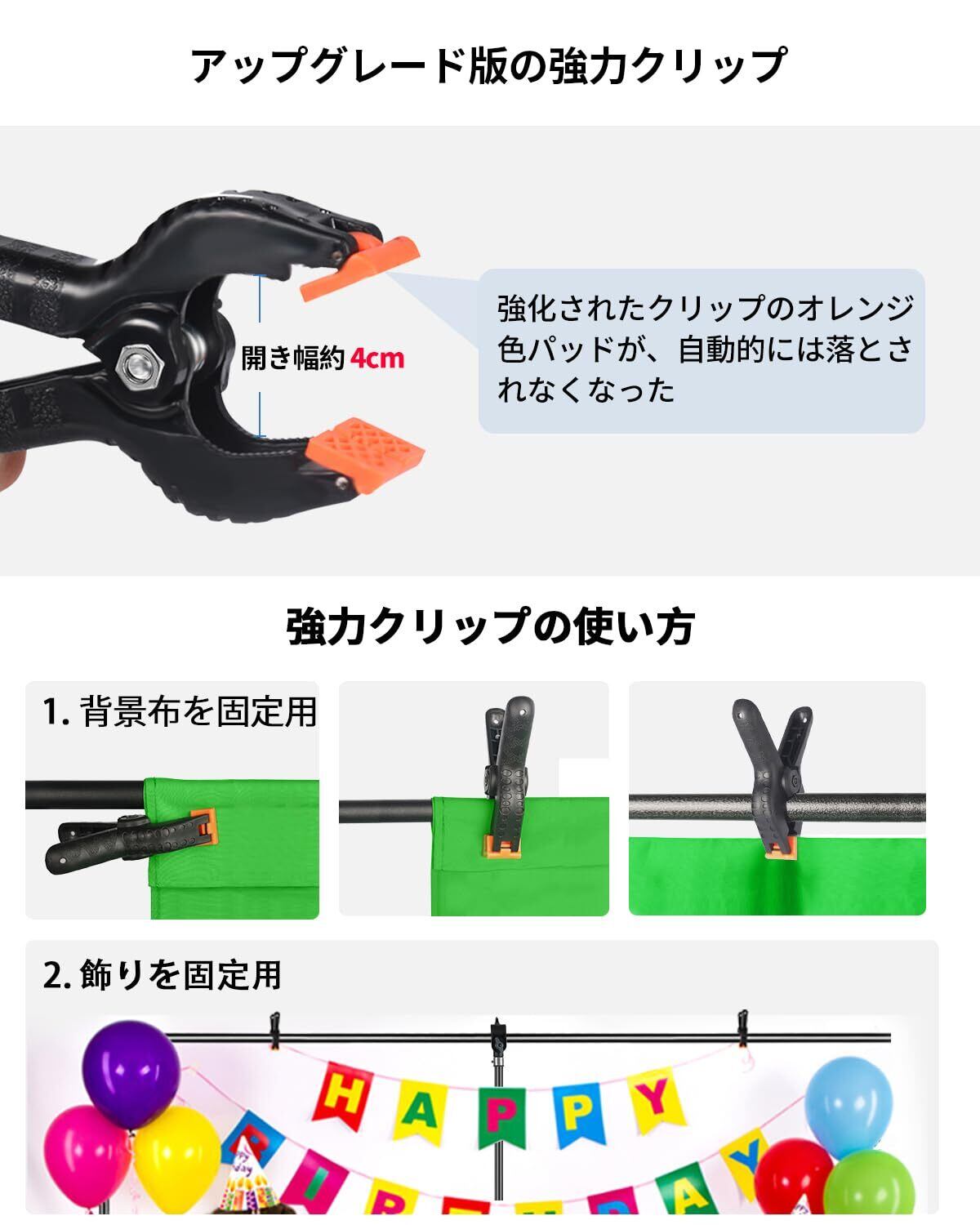 【強力クリップ付き】4つの超強力背景布のクリップが付き、背景シートや背景紙などしっかりと撮影背景スタンドに固定可能です。ご注意:強力クリップのオレンジ色のパッドは取り外し可能です。落とすと再度取り付けられます。また強力なデザインなので、使用時に力入れる必要であることをあらかじめご了承ください。