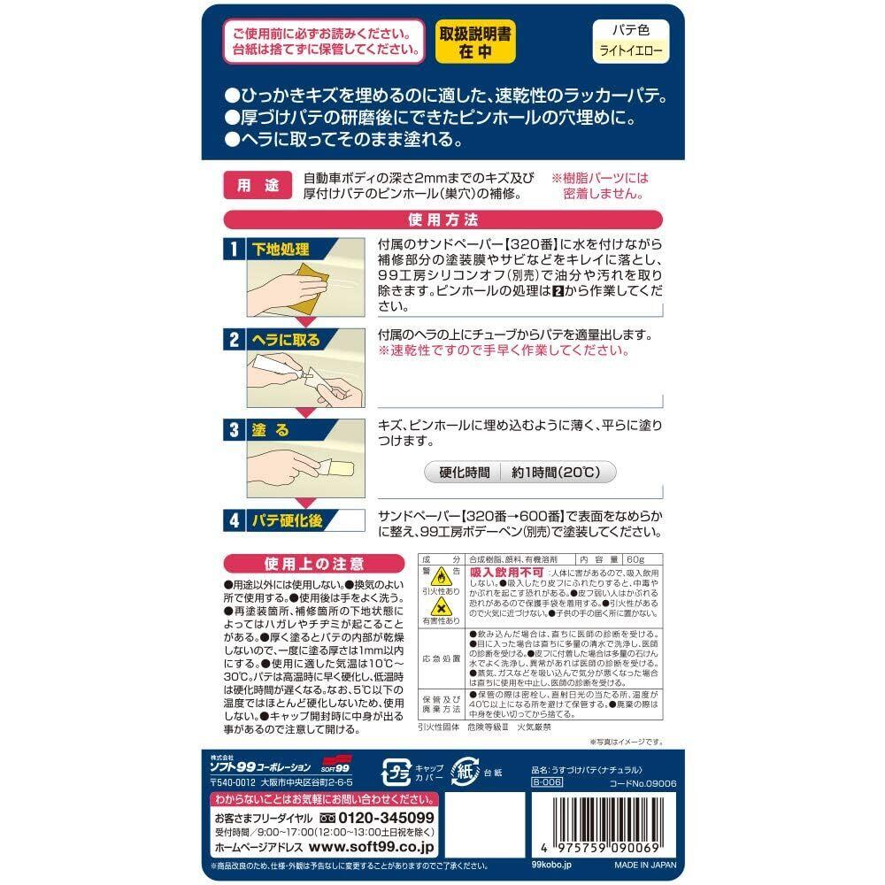 ソフト99(SOFT99) 99工房 補修用品 うすづけパテ ナチュラル 60g 自動車ボディの深さ2mmまでのキズ及び厚付けパテのピンホール(巣穴)の補修 09006