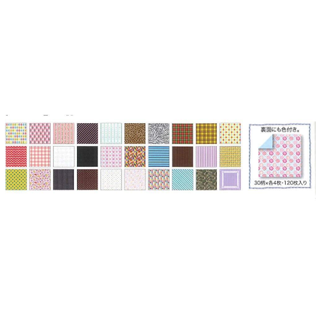 30柄が各4枚(合計120枚)入ったカラフルな柄が入った7.5cm角の両面千代紙。