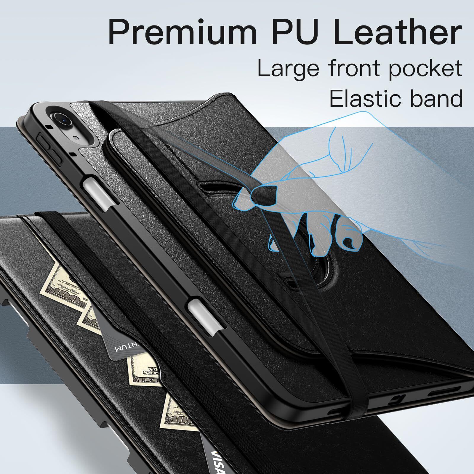 [多機能] カード、現金、メモなどを収納できる大きなフロントポケットがあります。また、iPadをケースにしっかりと固定するための外側の伸縮性ストラップも付属しており、調節可能な内側のハンドストラップでiPadをしっかりと保持できます
