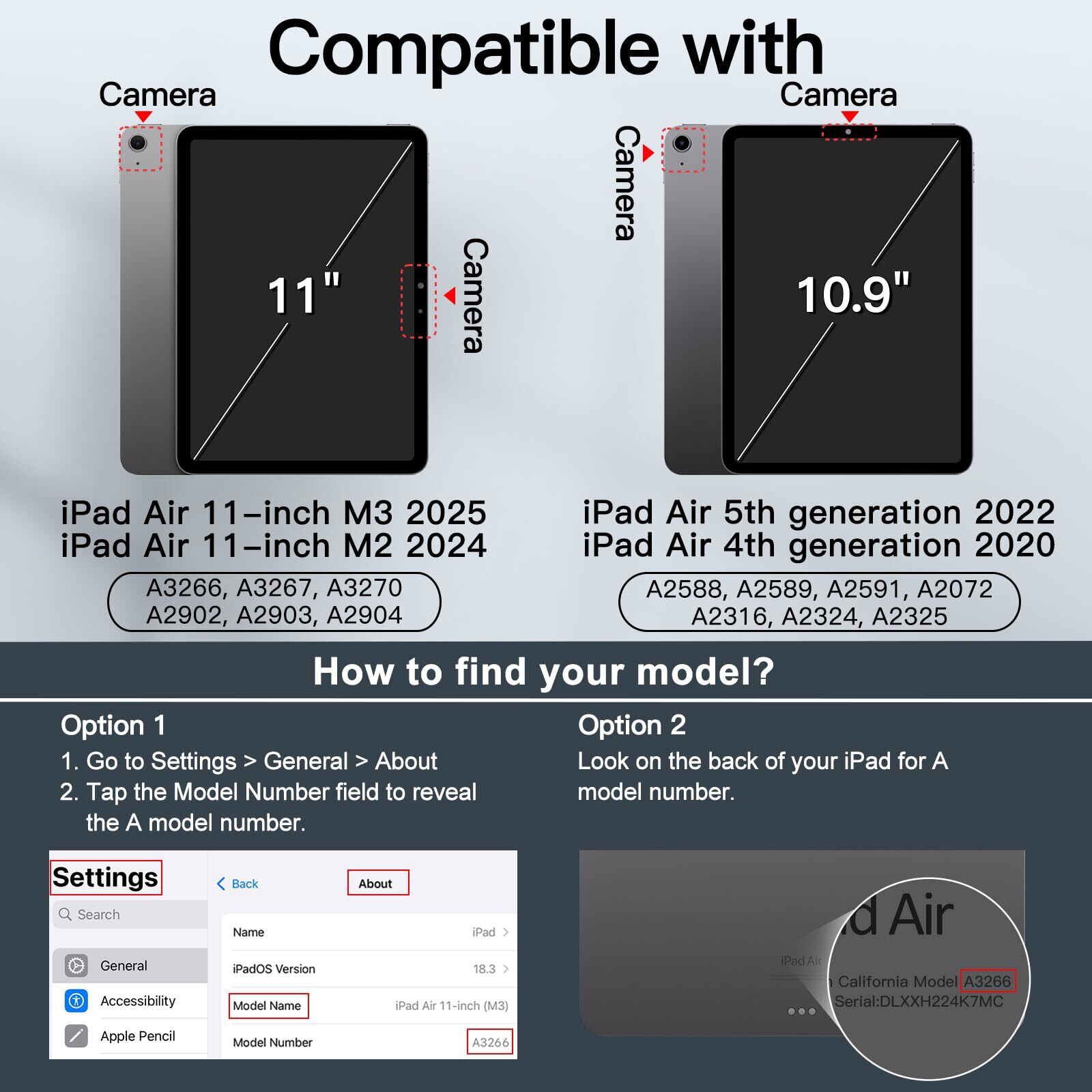 [互換性] iPad Air 11インチ M3/M2 (2025/2024)、iPad Air 5/4 (2022/2020モデル、第5/4世代、10.9インチ) 用に設計されています。対応iPadモデル: A3266 / A3267 / A3270 / A2902 / A2903 / A2904 / A2588 / A2589 / A2591 / A2324 / A2072 / A2316 / A2325。「設定」>「一般」>「情報」の順に選択します、「モデル番号」フィールドをタップしてAモデル番号を表示します