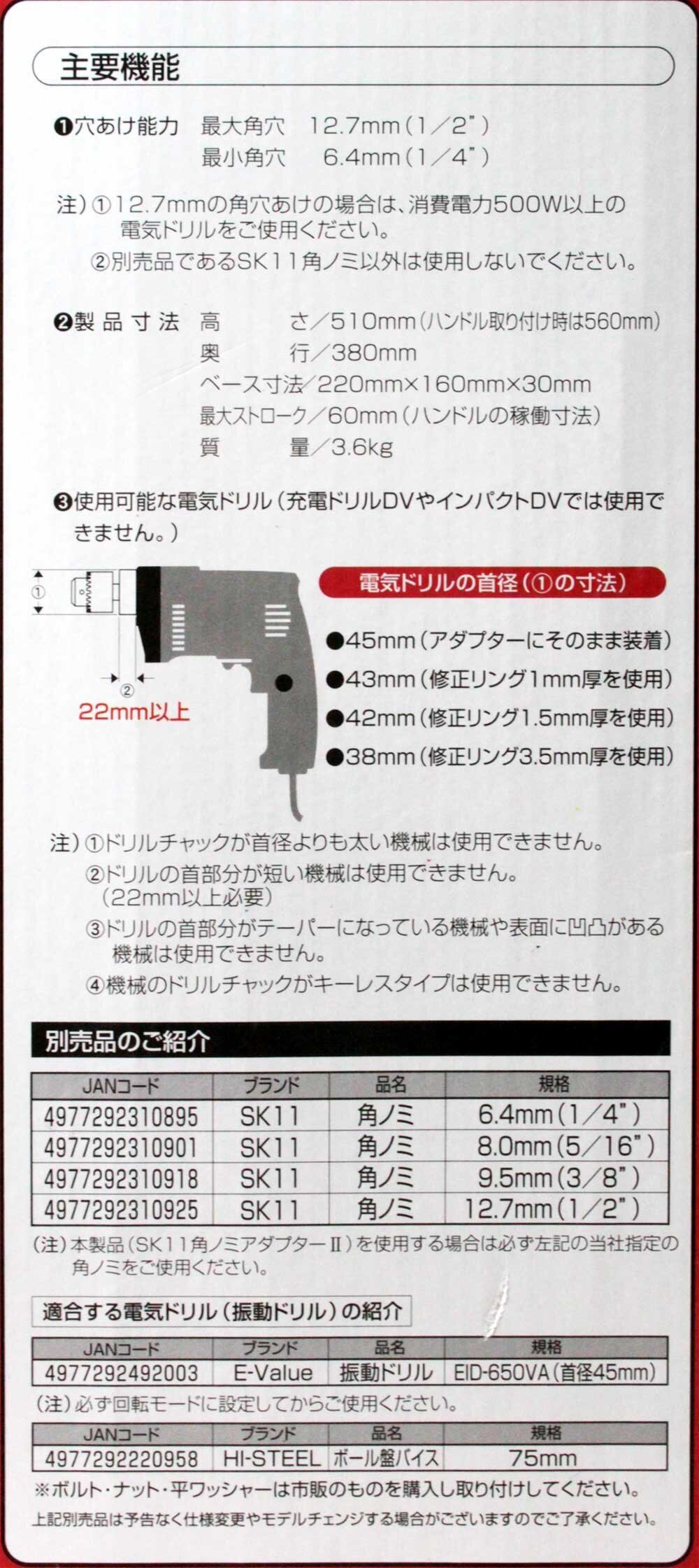 特徴:角ノミアダプターを取り外せば、丸穴用としてボール盤同様に使用できる