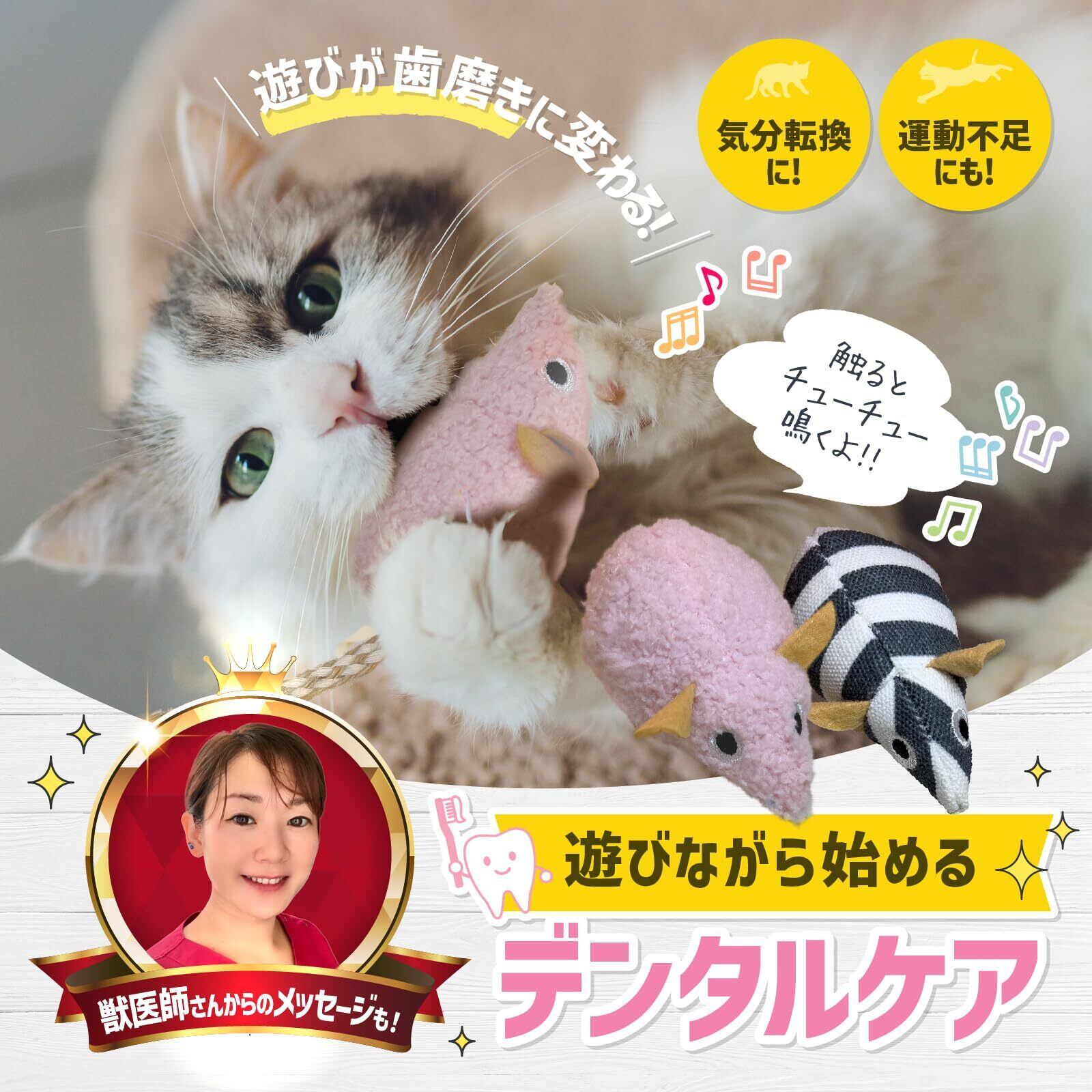 FelineBees(フィーラインビーズ) チュルルン 歯磨き オーラルケア 猫 玩具 おもちゃ 触ると音が鳴る ねずみ (2個入り) 噛むおもちゃ 運動不足 遊びをデンタルケアへ (おしゃれパリジェンヌ)