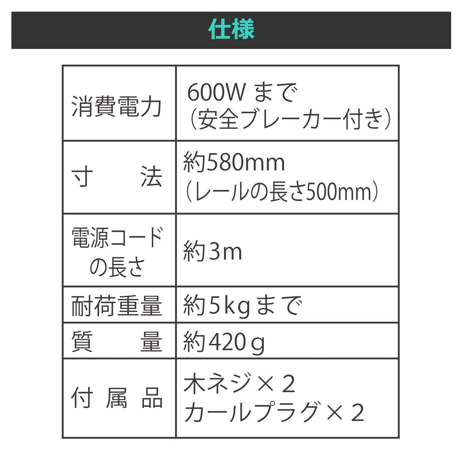 【 仕 様 】■ 消費電力:600Wまで(安全ブレーカー付き)■ 寸法:約580mm(レールの長さ500mm)■ 電源コードの長さ:約3m■ 耐荷重量:約5kgまで■ 質量:約420g■ 付属品:木ネジ×2、カールプラグ×2