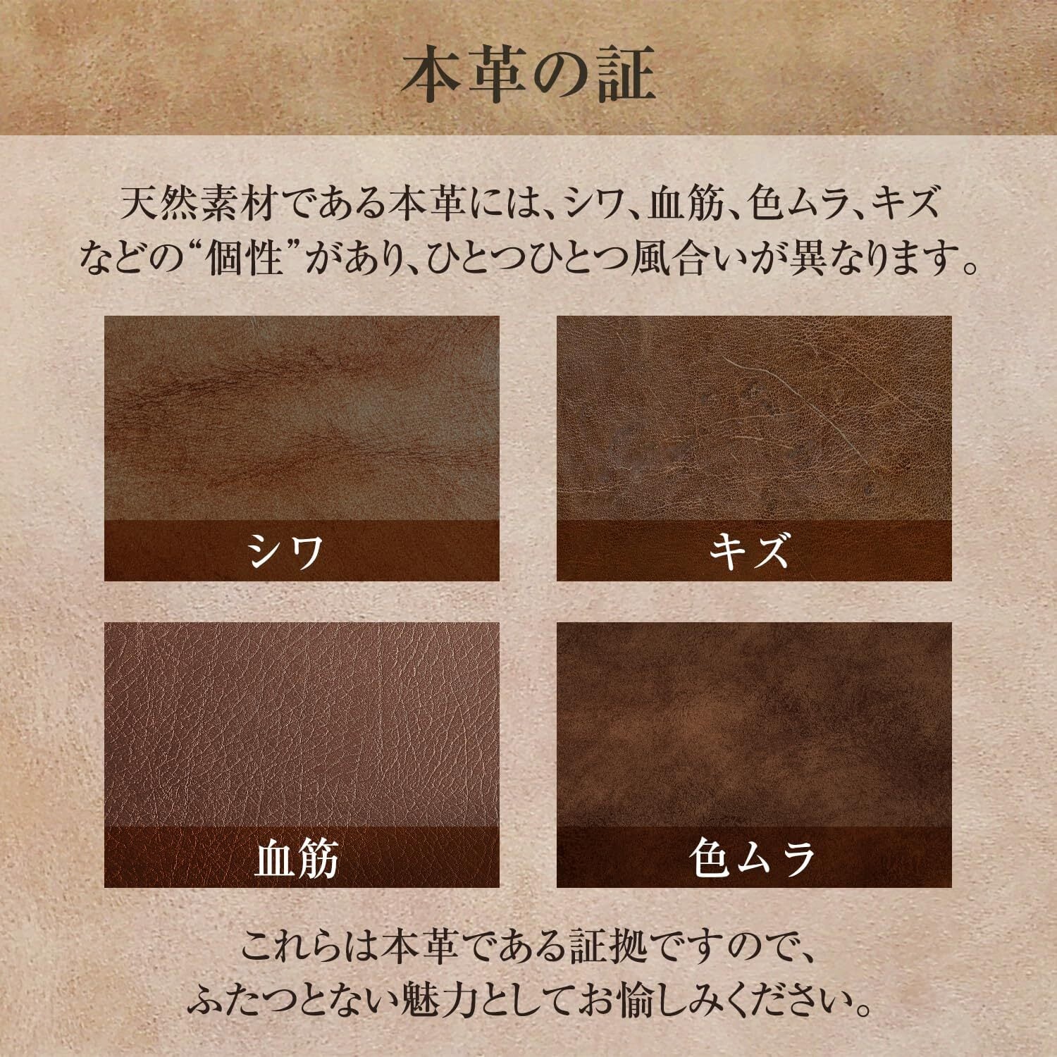 【革の個性について】 生きて活動をしていた動物の表皮から作られる皮革は、血筋、トラ、色ムラ、キズ等の個体差がございます。天然素材の証、革の個性としてお愉しみください。