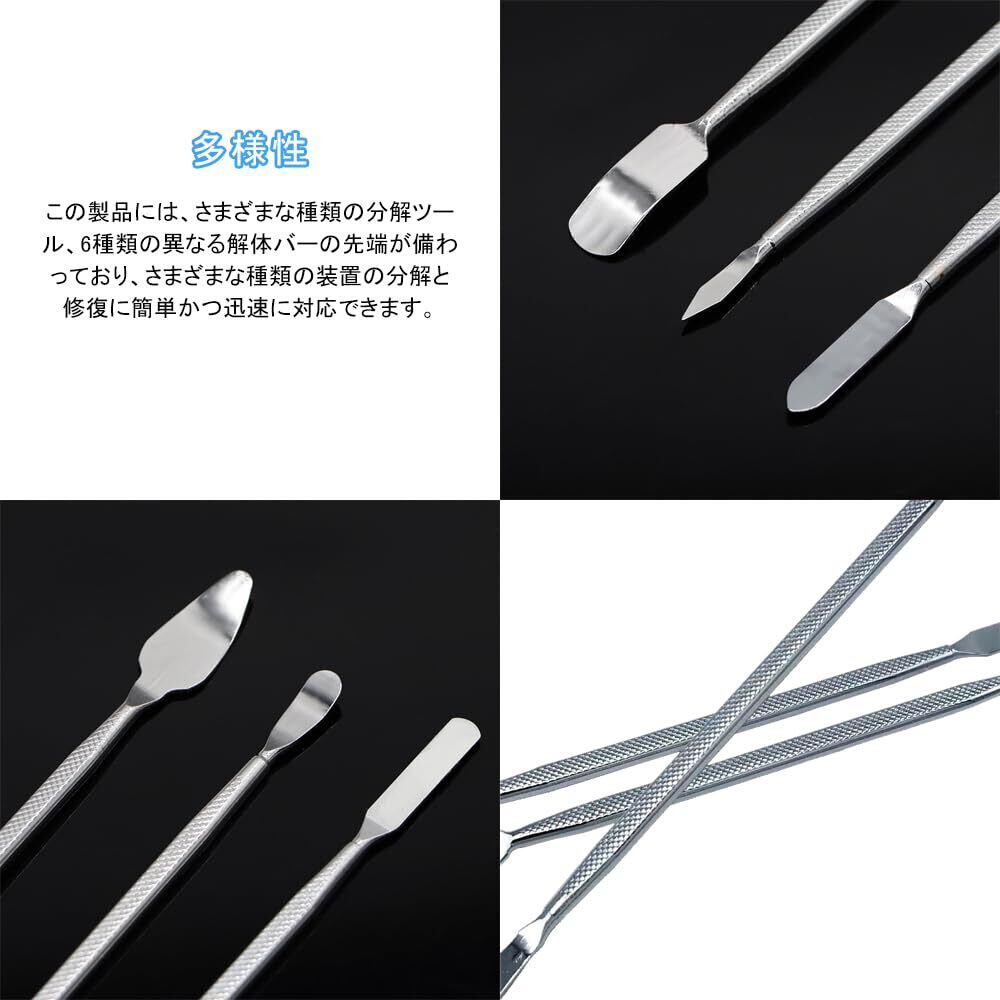 【多様性】このツールを利点は、その多様性にあります。この製品には、さまざまな種類の分解ツール、6種類の異なる解体バーの先端が備わっており、さまざまな種類の装置の分解と修復に簡単かつ迅速に対応できます。
