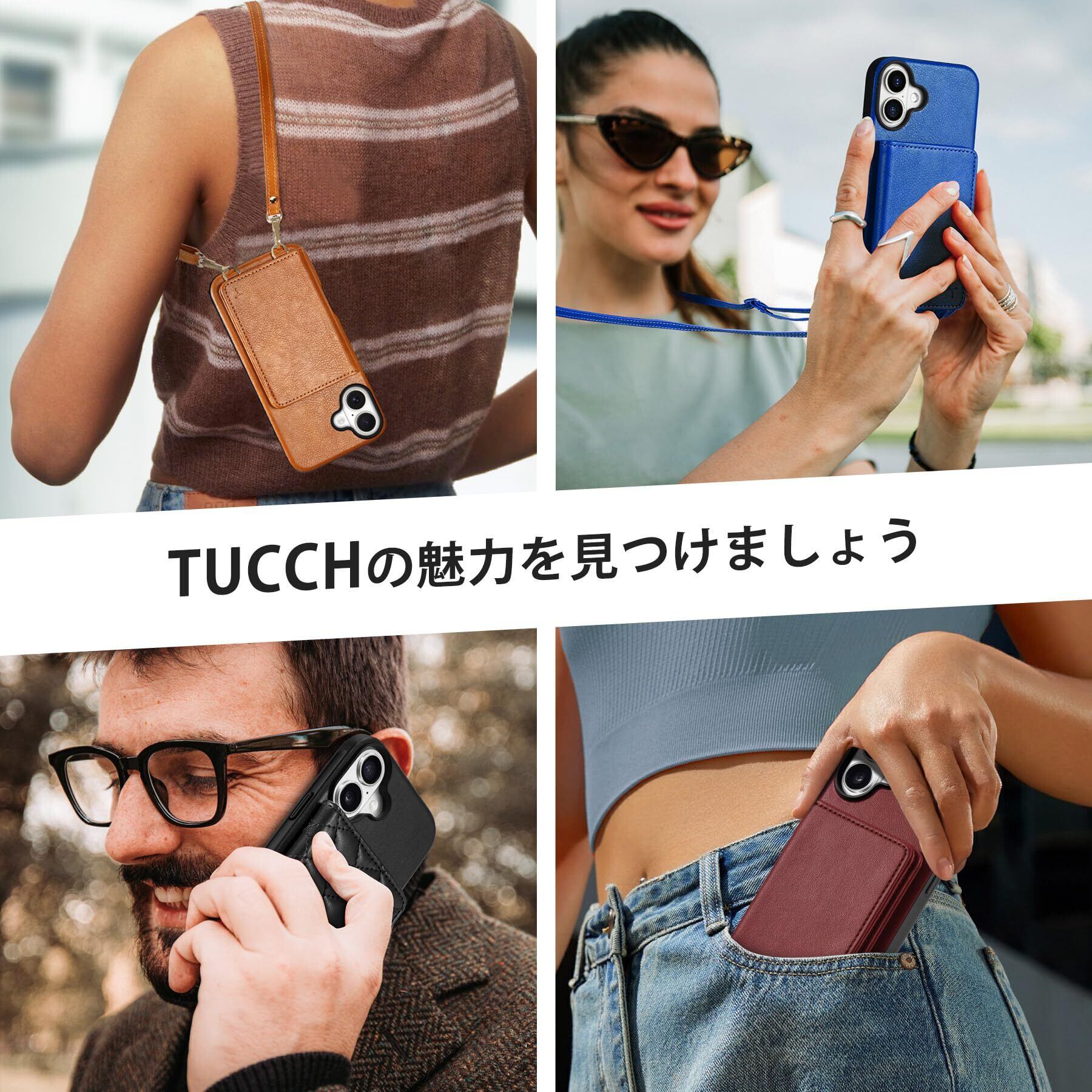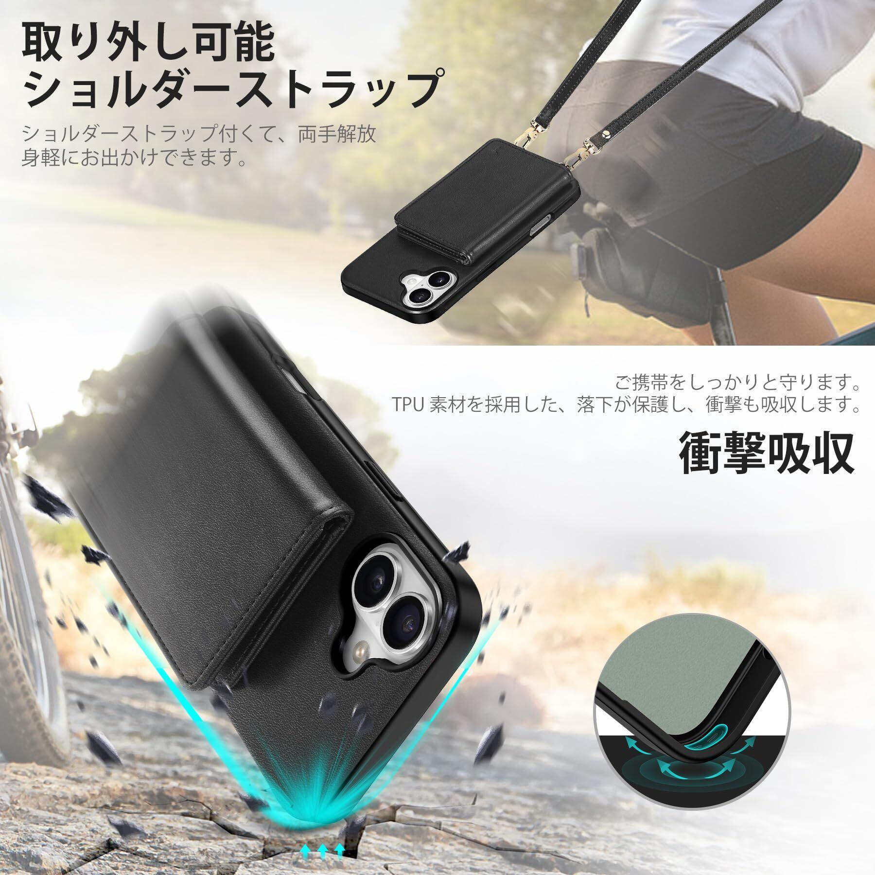 TUCCH iPhone16 Plus 対応 ケース 背面 手帳型 ショルダー ストラップ付き アイフォーン16プラスケース PUレザー [RFIDブロッキング] 6つポケット 取り外し不可 財布型 肩掛け 斜め掛け TPU素材 衝撃吸収 あいふぉん16プラスカバー (2024年発売 6.7インチ 5G アイフォン16プラス対応) ブラック