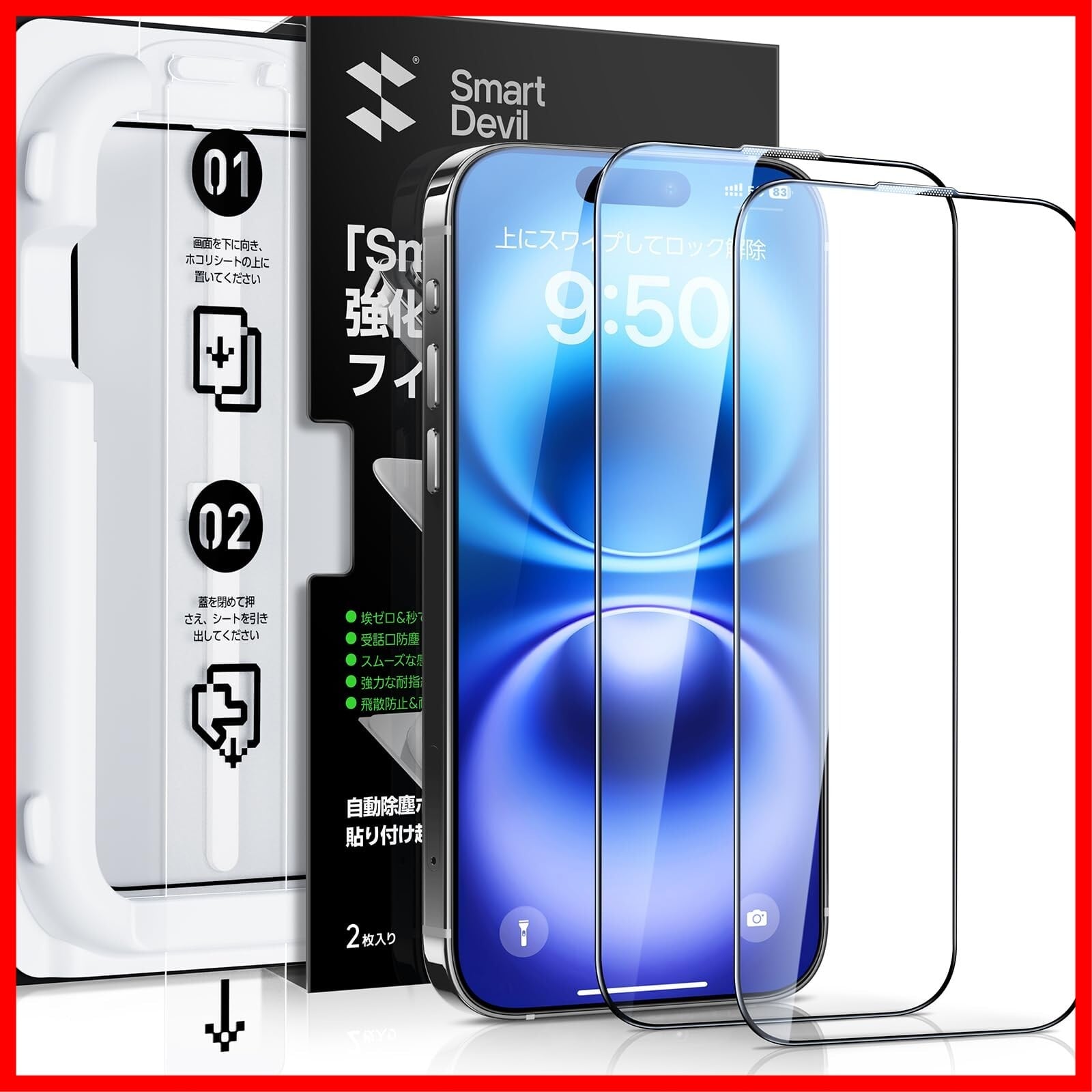 SmartDevil iPhone 16 用 ガラスフィルム 一体式ガイド枠付き 簡単貼り付け HDクリア 位置ずれない 気泡ゼロ 9H硬度 指紋軽減 ラウンドエッジ加工 光沢タイプ ツルツル いphone16 保護フィルム 2枚セット
