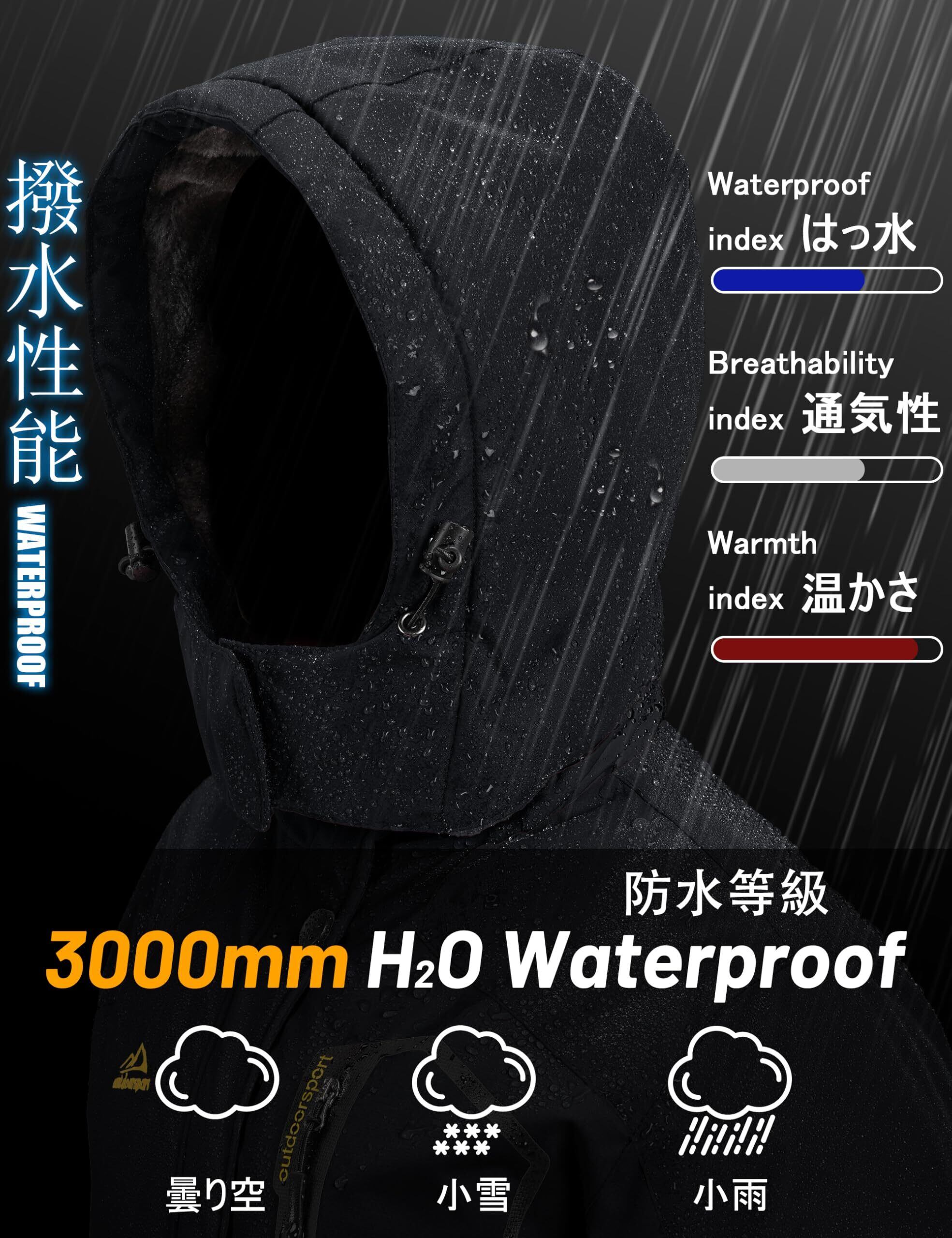 【表面生地】防水および透湿性指数 3000*1000、撥水性や防汚の機能も持っていますから、様々な気候や環境に対応できます。撥水ファスナー付いたポケット、シームテープ技術を採用し、有効的に防水できます。胸ポケットにも撥水ジップがつき、有効的に撥水します。