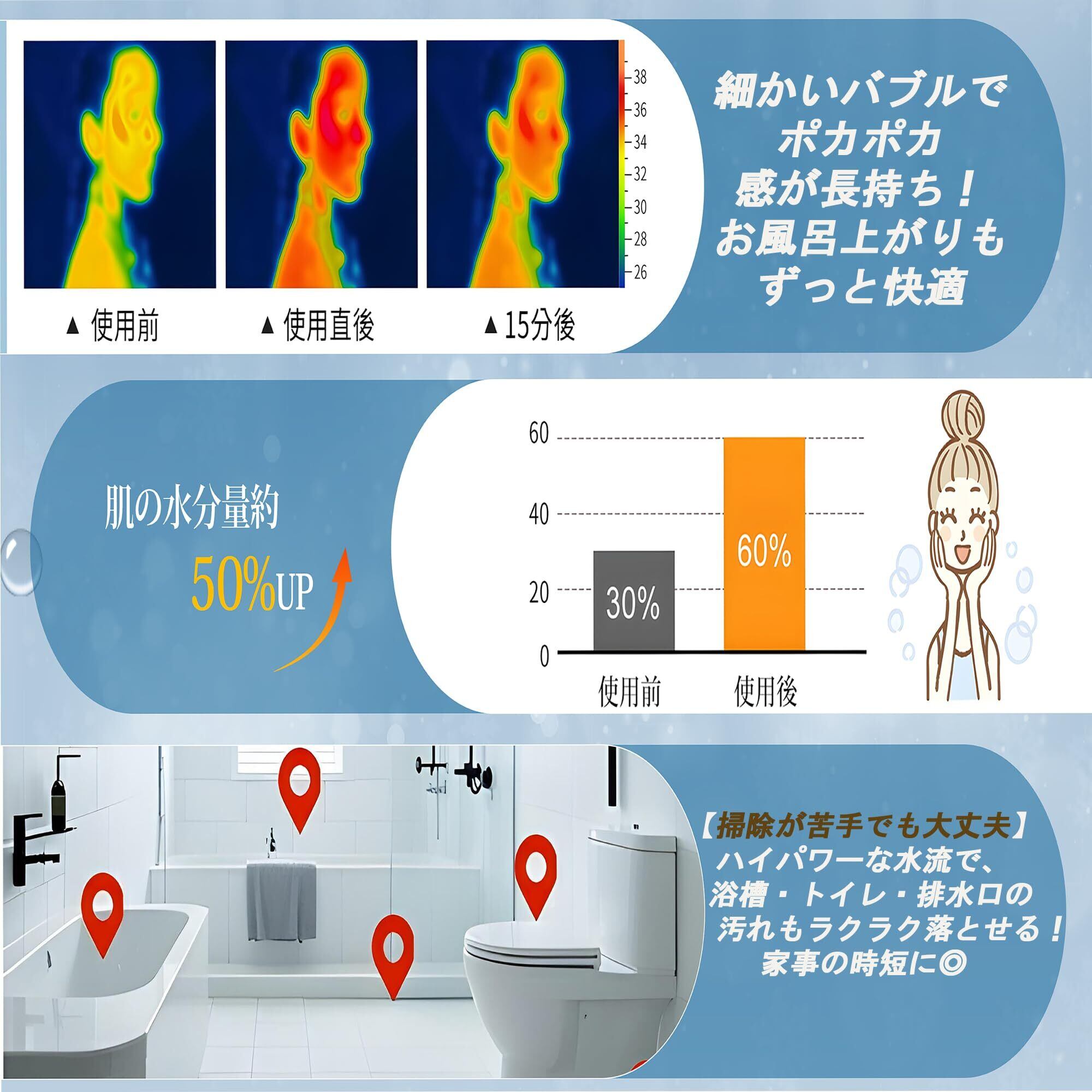 【驚きの6種類の出水モード優れた洗浄力】6種類の出水モードを搭載したマイクロナノバブルシャワーヘッドは、毎日のシャワータイムをまるでスパのような贅沢な体験に変えます。ストレートモードでは全身を効率よく洗浄し、柔らかなミストモードなら顔に当てても刺激が少なく肌に優しい洗い心地が楽しめます。ストレートミストモードは効率的かつ優しい洗浄で快適なバスタイムを提供し、マッサージモードは心地よい水流で全身をリラックスさせます。さらに、ストレートマッサージモードは適度な刺激で汚れをしっかりと除去し、力強いジェットモードは全身をスッキリと洗い流すとともにトイレの掃除にも役立ちます。細やかな水流設計により毛穴の奥までしっかりと洗浄され、心地よい水圧が肌に優しく作用するためリフレッシュ効果も抜群。シャワーの楽しさを再発見したい方にぴったりの一台です。