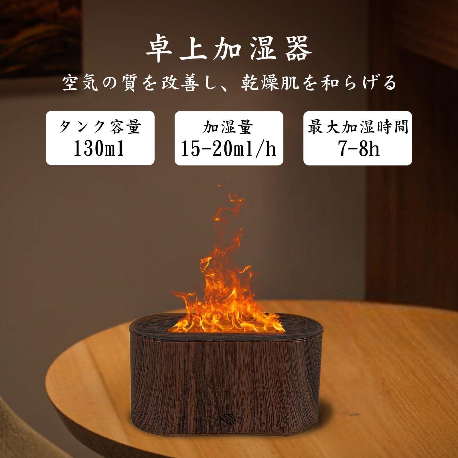 Todeco アロマディフューザー 炎 加湿器 7色LEDライト 小型 卓上加湿器 超音波加湿器 アロマ対応 静音 Type-c 給電式 空焚き防止 自動オフ ポータブル 寝室 リビング オフィス デスク 乾燥/花粉症対策(ダークウッド)