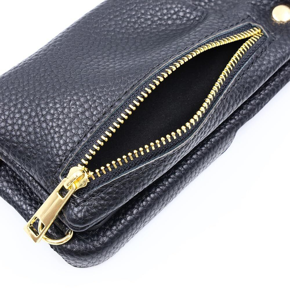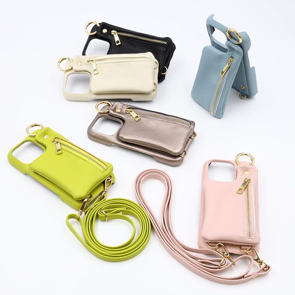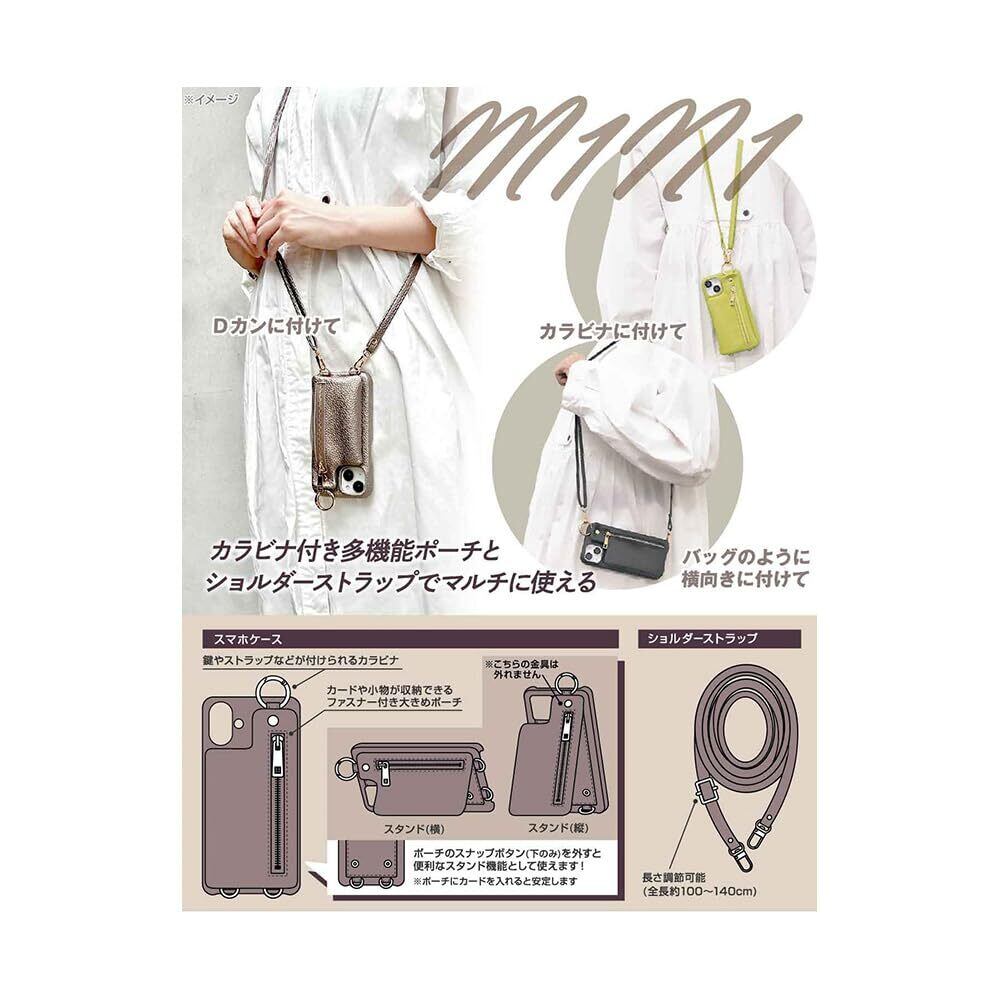 カードやリップなどが入る便利なポーチ付き。ポーチはスタンドとしても使用可能。長さ調整が可能なショルダーストラップ。