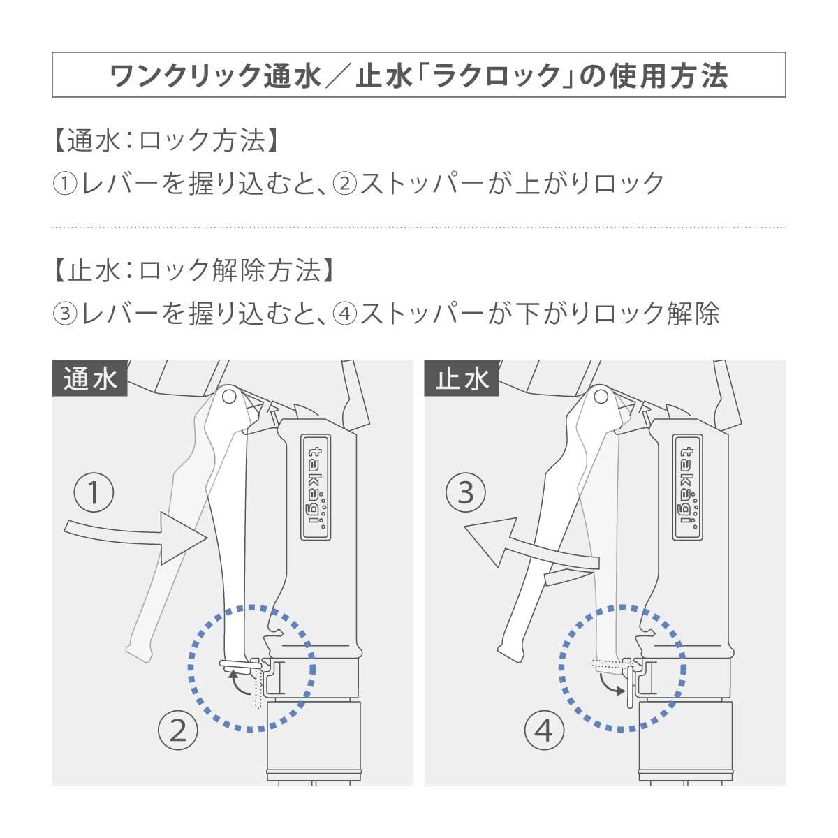 レバーを握ると連動してストッパーがロックされ、通水中の手への負担を軽減します。