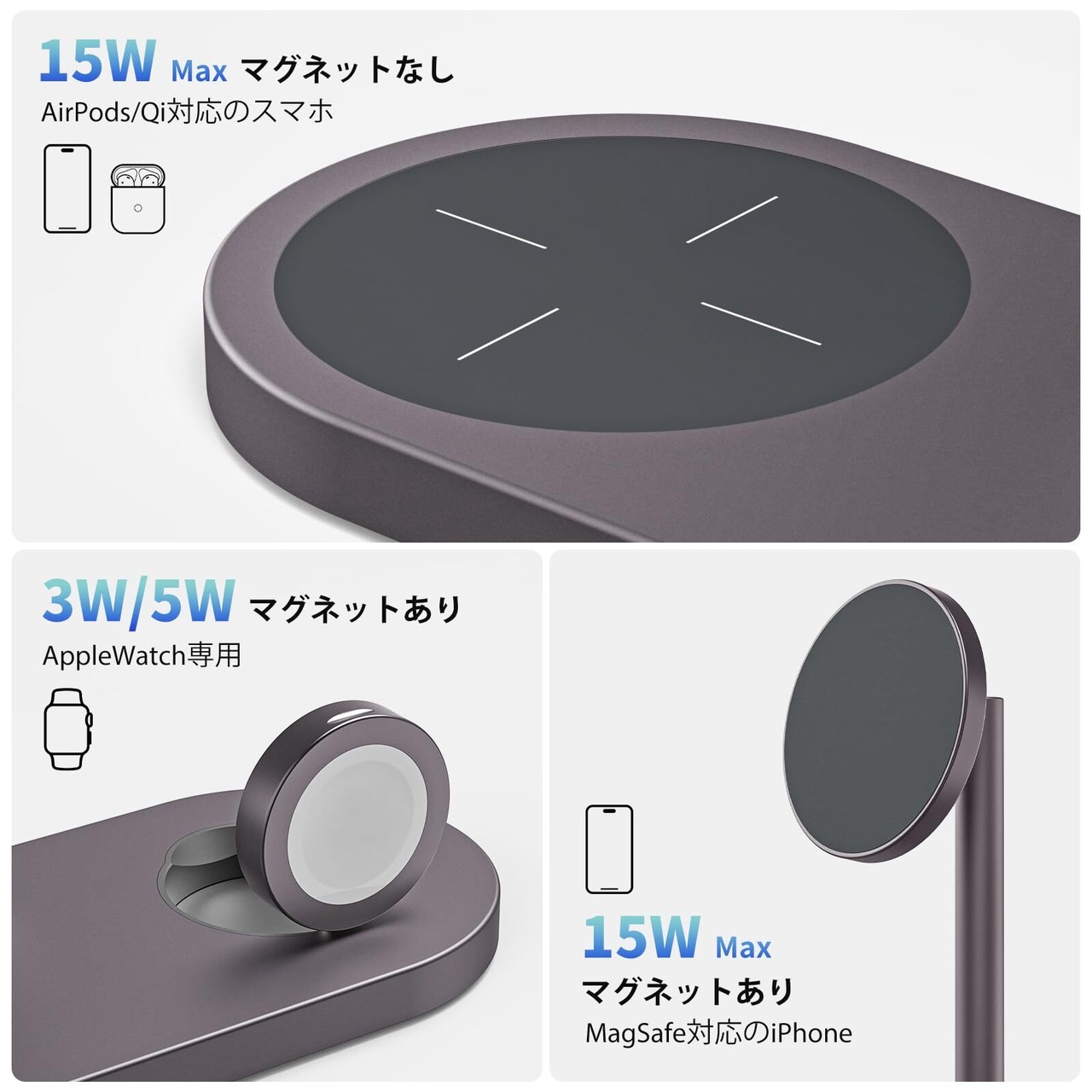 【一台三役ワイヤレス充電環境】この3in1充電器は、iPhone16/15/14/13/12シリーズ・AirPods・アップルウォッチに対応しておりますので、異なる充電器を使う手間を省き、これ一台で完結。絡まりやすいケーブルを使用しないため、デスク周りやナイトテーブルが常に整然とした状態を保てます。さらに、充電中のスマホを所定の位置にしっかり固定し、瞬時に位置合わせが可能な磁気整列機能を備えています。まさに置くだけ充電の快適さを提供します。