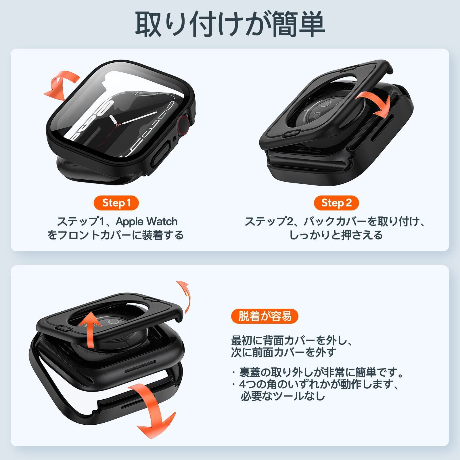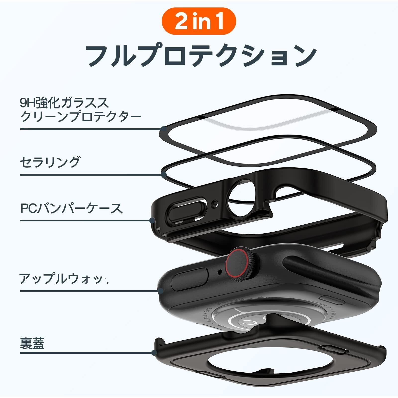 【新デザイン】新しい2 in 1二重構造のApple Watch ケース、360°全方位カバーを実現し、Apple Watchを完全に保護します。ケースのフレームはPC(ポリカーボネート)素材で構成されており、優れた耐傷性と耐衝撃性を持ち、意図しない落下や傷などからApple Watchへのダメージを最小限に抑えます
