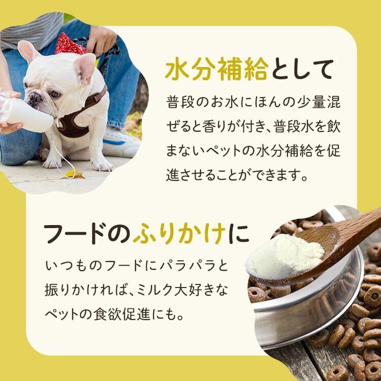 ●使用方法:体重3kg毎に付属の計量スプーン1杯分(約3g)を目安にお与えください。ミルクとして与える場合は粉ミルク1:ぬるま湯10(5g:5cc)でご使用ください。※ペットの好みに合わせて濃さを調整してください。
