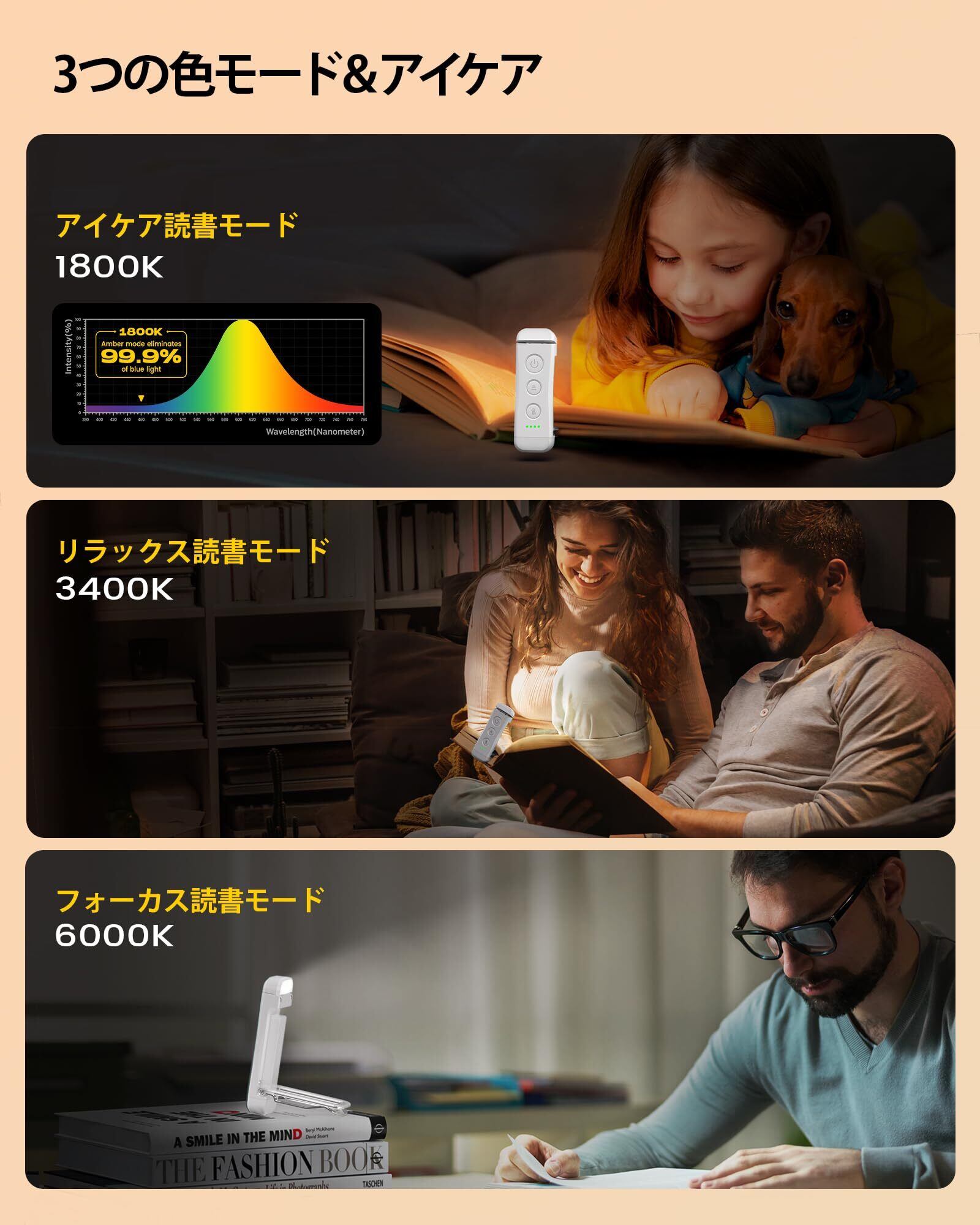 [3つのカラーモード&目に優しい] ベッドの本用の読書灯とは異なり、当社の小さな読書灯には3つの異なる読書モードがあります: アンバーモード (1800K)、ブリーズモード (3400K)、正確なモード (6000K)。 アンバーモードは、99.9 %のブルーライトをフィルターし、目を保護し、目の疲れを軽減します。 ブリーズモードは、斬新な読書と詩の読書のための心地よく快適な読書の世界を提供します。 正確なモードは領域をはっきりと強調し、本のあらゆるディテールに集中できます。