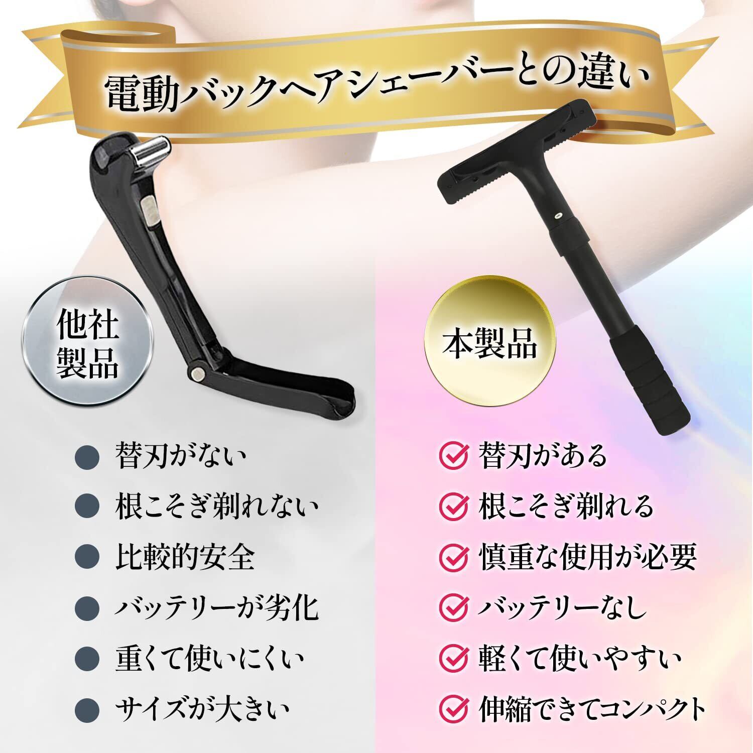 高品質カミソリで根こそぎ剃れる!今まで手が届かなかったところに手が届く。背中毛、腰回り、ふくらはぎなどの無駄毛の処理に。ハンドル+刃1個の基本セットです。