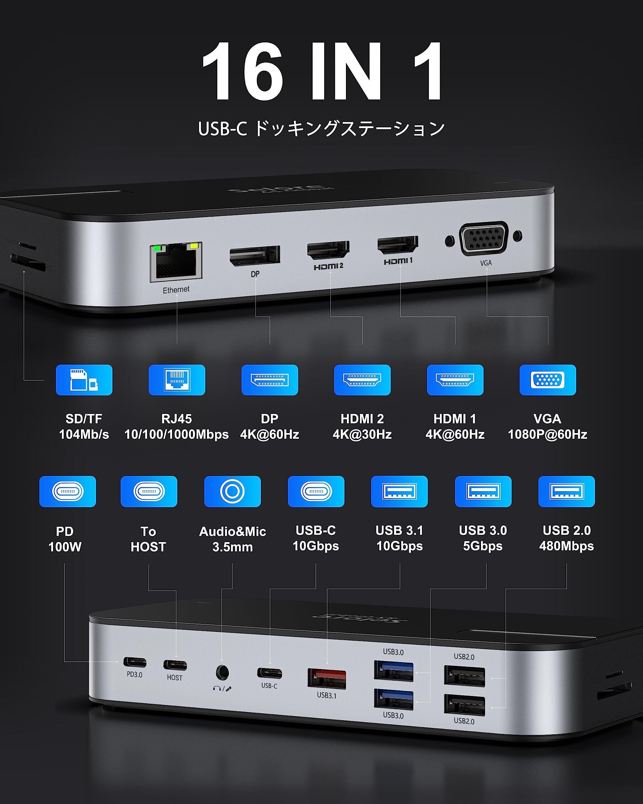 USB C ドッキングステーション type c Dock 【16 in 1】 3画面モード トリプルディスプレイ対応 87W出力 デュアル 4K HDMI出力ポート (16in1)…