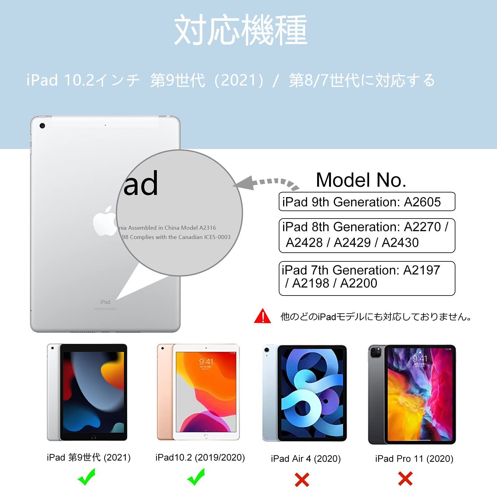 対応デバイス 対応iPad 第9/8世代 2021/2020/第7世代 2019(モデルナンバー:A2197、A2200、A2198、A2270、A2428、A2429、A2430)