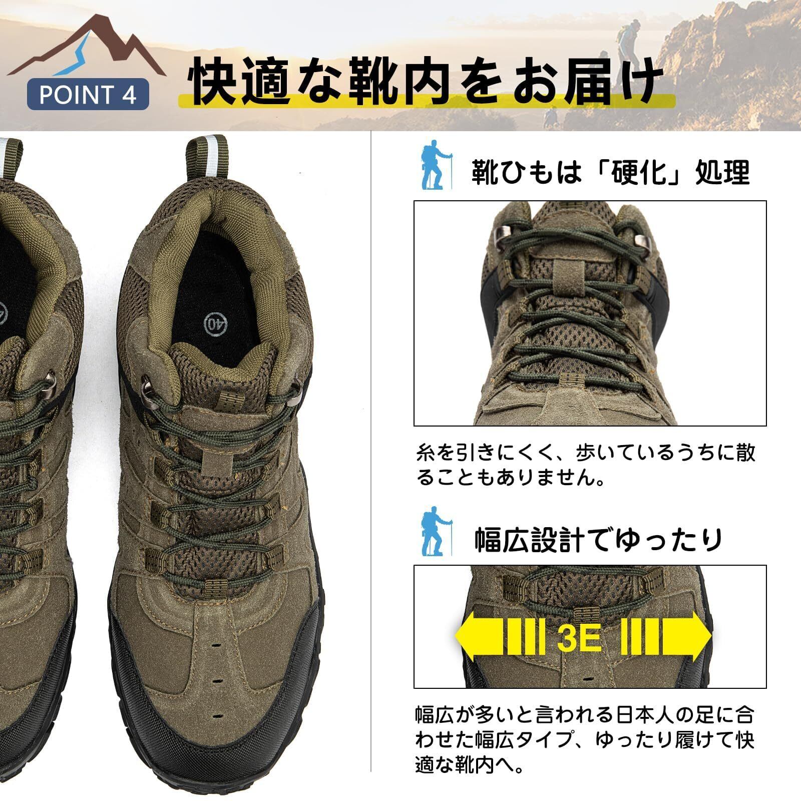 高耐久性で過酷な環境にも対応 登山やハイキング、キャンプなどの厳しい環境にも対応できる高耐久性の登山靴。高品質なラバーソールと強化レザーを使用し、岩場や泥道でも長持ちします。アッパー部分は高い強度を誇り、登山や山登りでも足元をしっかり守ります。過酷な環境でも長時間使用でき、アウトドアやハイキングに最適です。