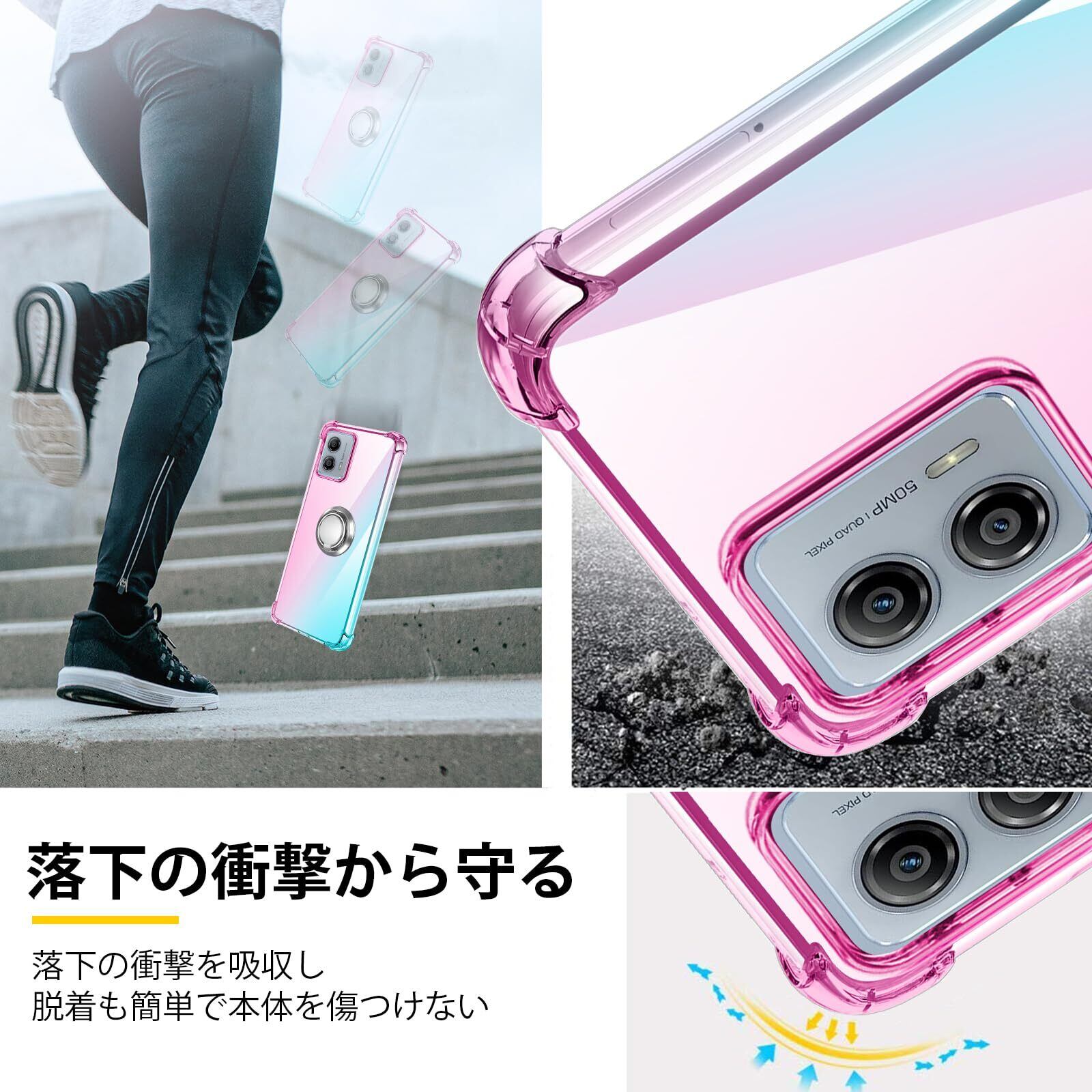 MOTO G53j ケース リング TPU 薄型 軽量シリコン グラデーション色 ケース Moto G53y 5G ケース スマホケース MOTO G53 カバー 耐衝撃 指紋防止 車載ホルダー対応 防塵 一体型 人気 携帯カバー (ピンクグリーン) | hananoki