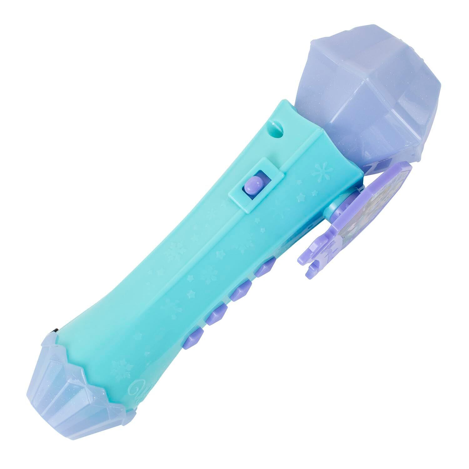 アナと雪の女王のピカピカ光るマイクです。効果音ボタン、メロディボタンの2種類あり、『効果音ボタン』を押すと素敵な魔法の音が鳴ります。『メロディボタン』は、アナと雪の女王の名曲の「雪だるまつくろう」「生まれてはじめて」「レット・イット・ゴー~ありのままで~」の3曲がフルメロディーで流れます。みんな大好きなあの名曲をマイクを持って歌おう!