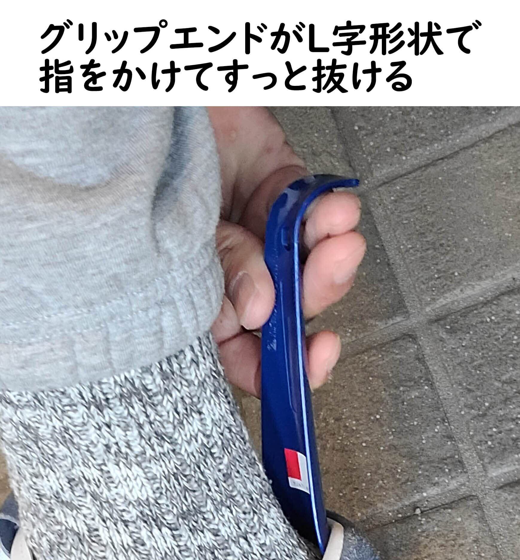 グリップエンドは棚などに引っ掛けることもできるフック構造、さらにループ付きで紐などで吊り下げもできる。機能性、デザイン性が洗練された靴べら。
