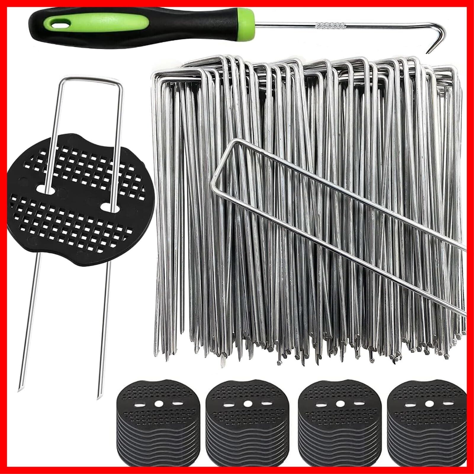 セット内容:U型釘杭:縦15センチx横3センチx直径約3ミリ、200個。黒い丸200個とフック1個とディスペンサー手袋も含まれています。