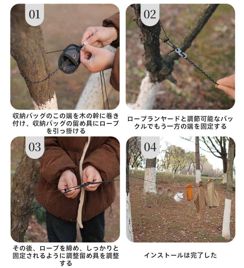 【多機能で幅広い用途】タオルや衣類はもちろん、キャンプ用品やその他のアイテムを干すのにも適しています。旅行先、バルコニー、キャンプ地など、さまざまな場面で活躍するこのロープは、アウトドア愛好者や旅行好きには欠かせないアイテムです。
