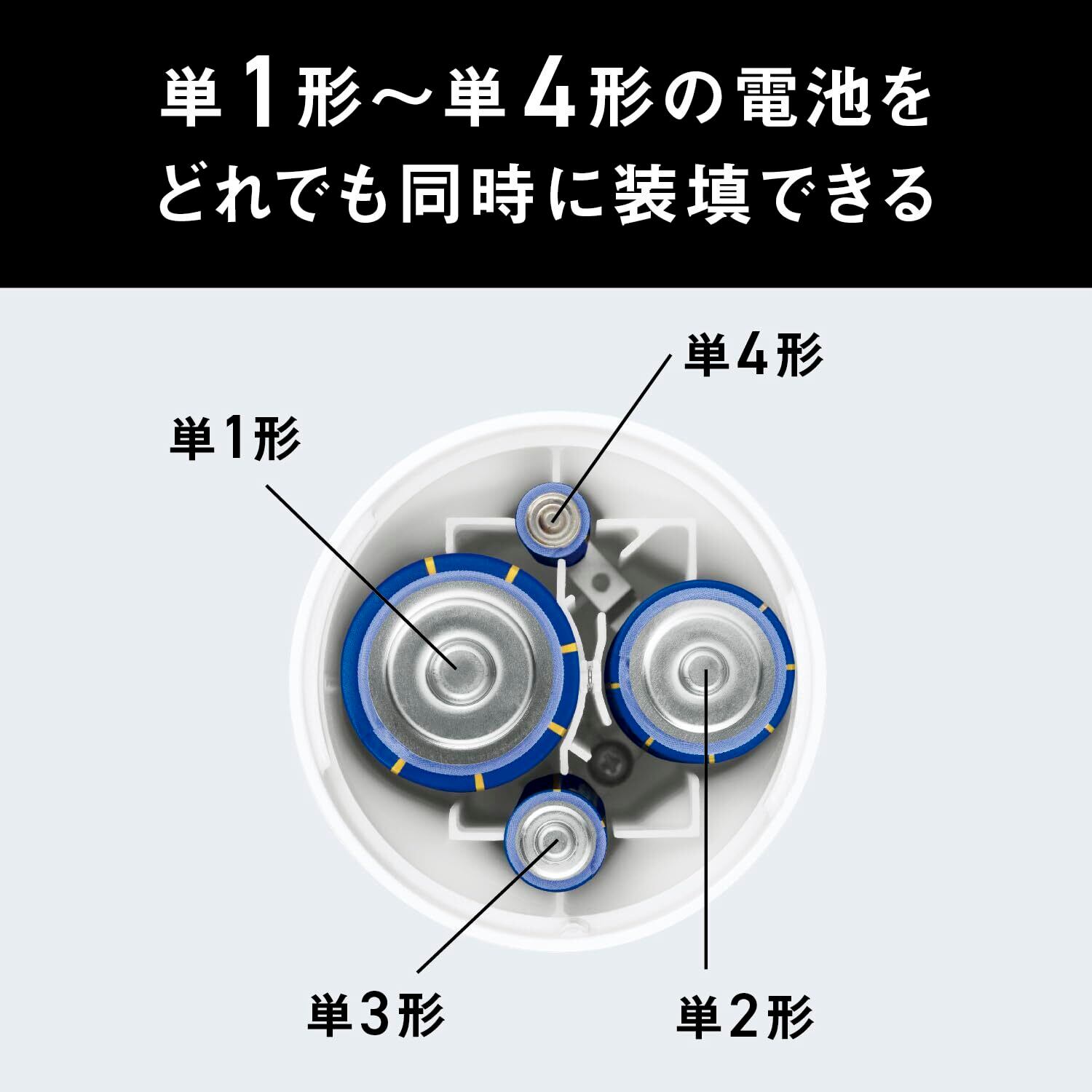 ・単1形~単4形の電池がどれでも1本で使える(充電池使用可能)