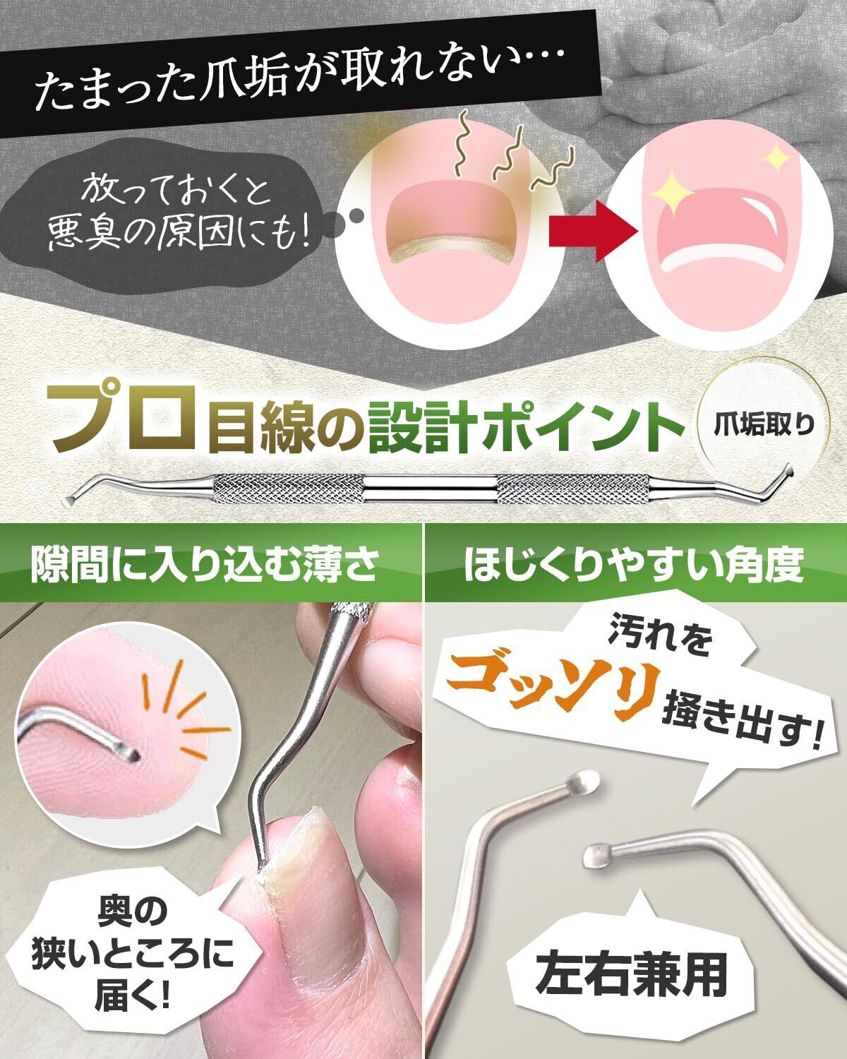 爪垢取り①【最適な角度と厚み】最適な角度(カーブ)により操作性が向上。また、薄型設計のサジにより爪と指の間にスムーズに入り込みます。力を入れずに爪垢を取り除くことができ、効果的なフットケアが可能になりました。②【左右非対称設計】右利きでも左利きでも問題なく使用可能。また、自分自身でのケアはもちろん、他人によるケアもストレスなく行えます。左右対称のデザインに比べ、使いやすさと効率性が向上しました。