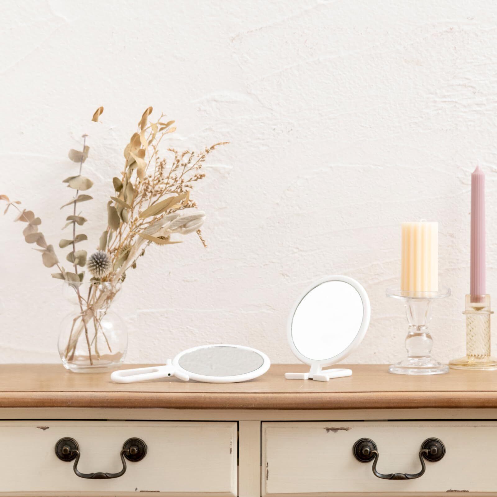 【便利な折立ハンドミラー】手鏡として十分な大きさで、必要な部分をしっかり写すことができます。またハンドル部分を折り立てて、鏡を立たすこともでき卓上ミラーとしても使用できます。