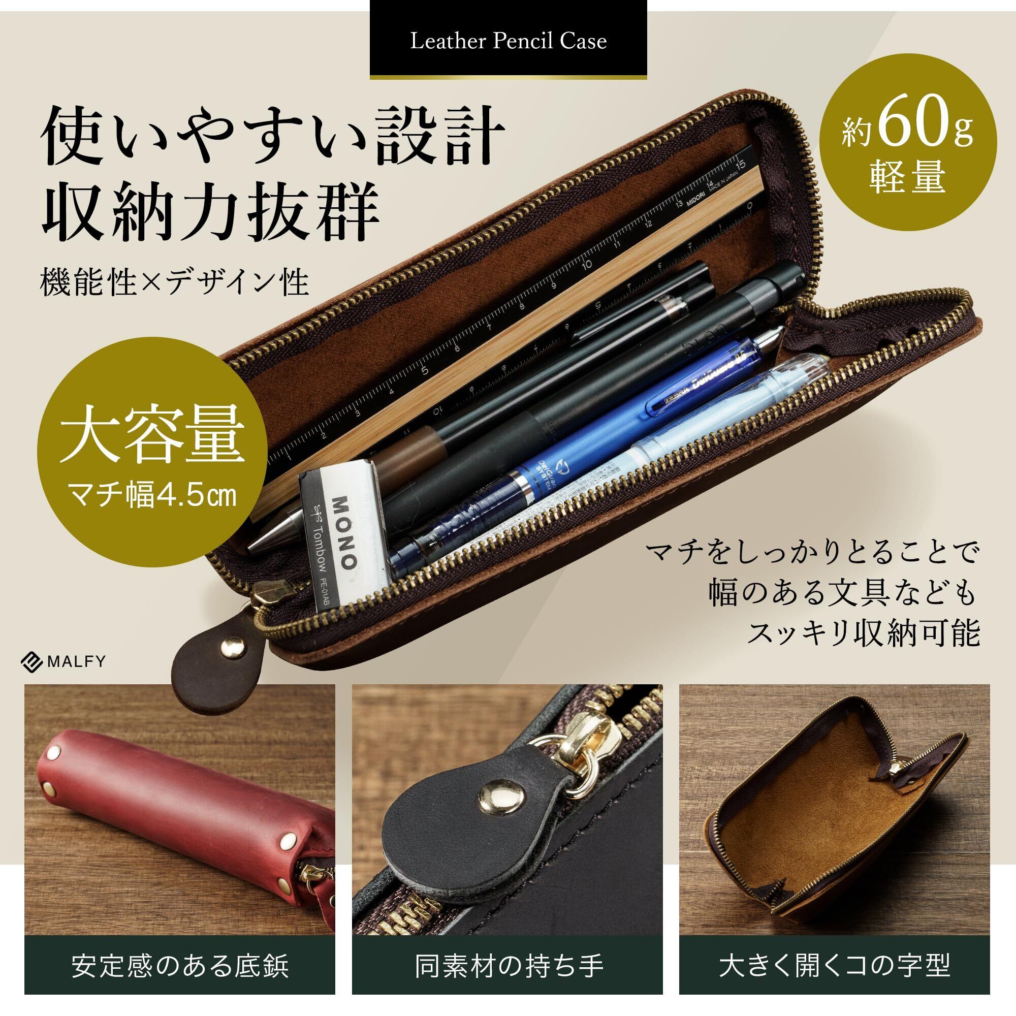 【商品詳細】〇サイズ:長さ19cm×高さ6cm×幅4.5cm 〇重量:約60g 〇素材:牛本革(クレイジーホースレザー)〇セット内容:ペンケース、真鍮製ブックマーククリップ 〇ブランド:MALFY ※国内自社検品