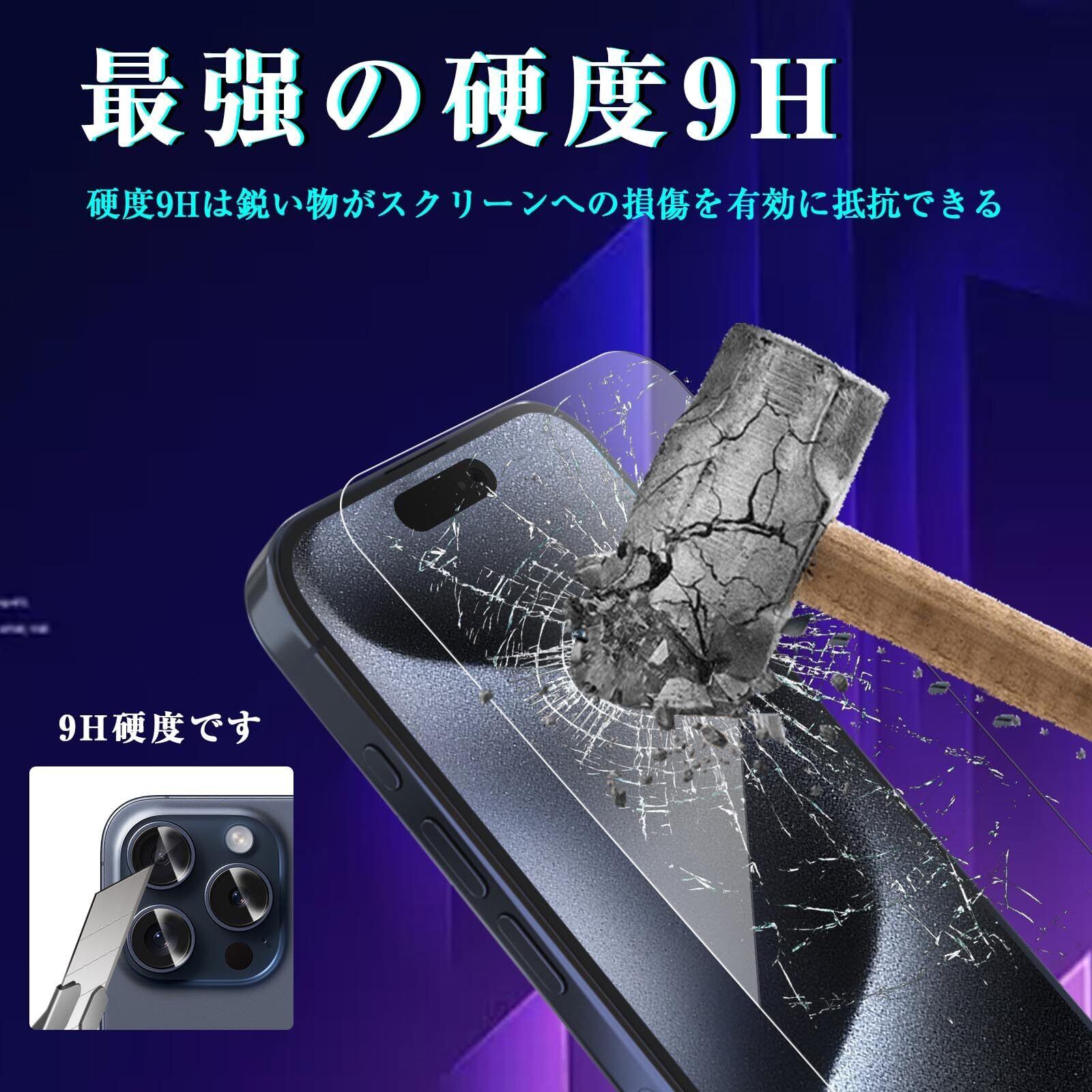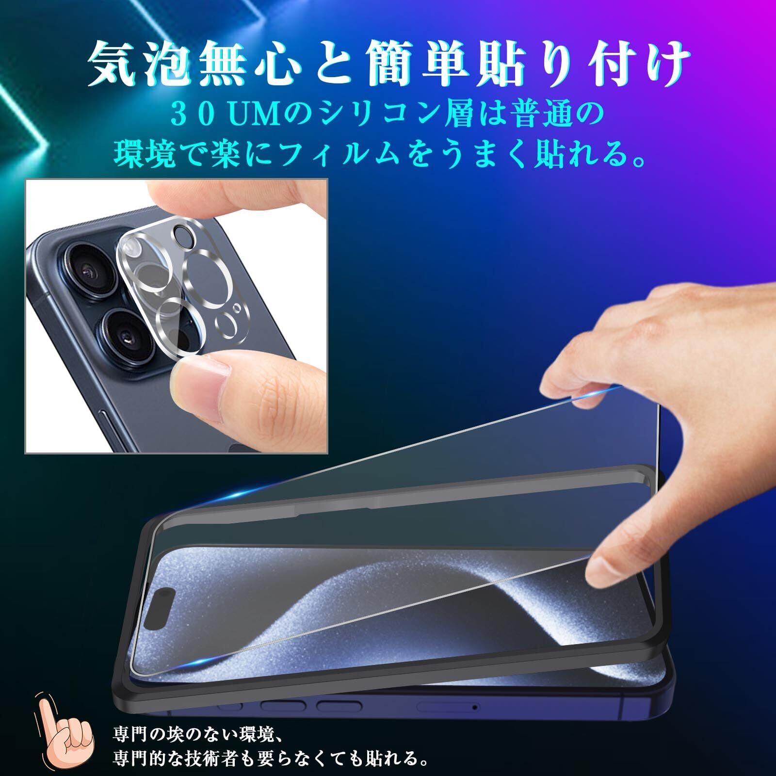 【旭硝子素材-9H硬度】iPhone 15 Pro 用 強化ガラス 保護フィルムは日本旭硝子素材を採用します。400℃の焼戻炉で4時間加熱し、二次強化し、硬度が9H硬度に達しています。 ポケットの中の鍵やコインなど、様々なものからスマートフォンを保護します。 防爆、耐スクラッチ性、落下防止。※ヒント:二次強化後の旭硝子は、靭性が高く、割れにくいです。ガラスの表面に防爆PET層を追加し、万が一、衝撃を受けて割れても飛散せず、ご自身の安全を守ります。
