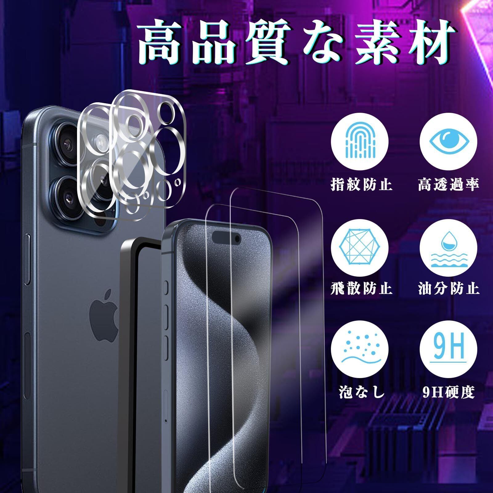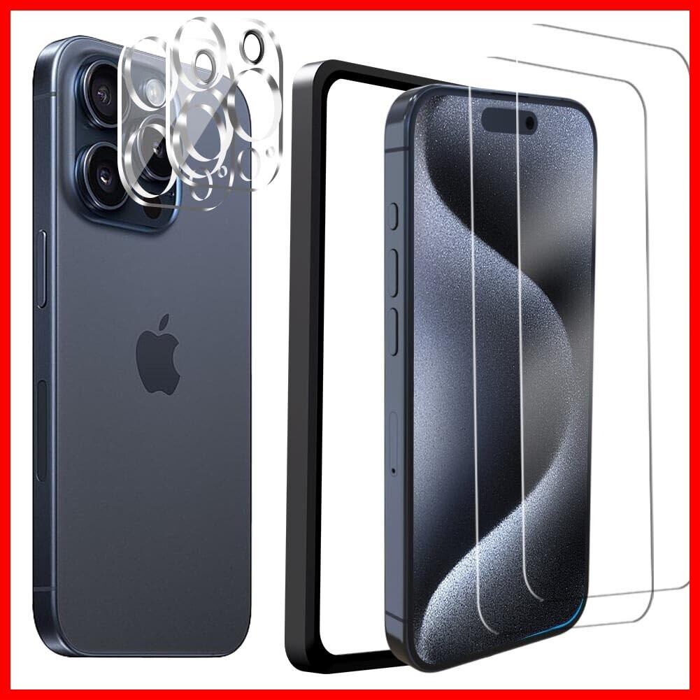 Besecou ガラスフィルム iPhone 15 Pro 用 2枚 + カメラフィルム 2枚 旭硝子素材製 ガイド枠付き 強化ガラス 液晶保護 9H硬度 耐衝撃 気泡防止 高感度タッチ 指紋防止 防水撥油 飛散防止 アイフォン 15 Pro / いphone15 Pro 対応