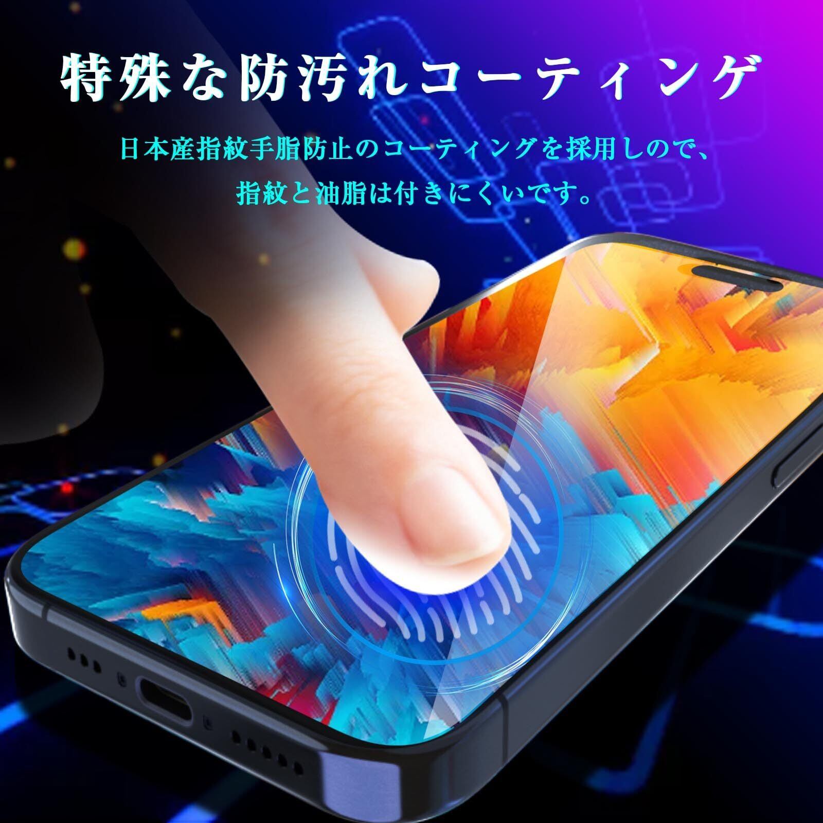 【指紋防止 飛散防止】iPhone 15 Pro 用 ガラスフィルムは特殊なコーティング加工を施しましたので油や指紋など付いても軽く拭けば汚れはすぐに落ちます。保護フィルムは防爆性のプラスチックの層があり、ガラスが破損した場合、破片が飛ばず安全です。