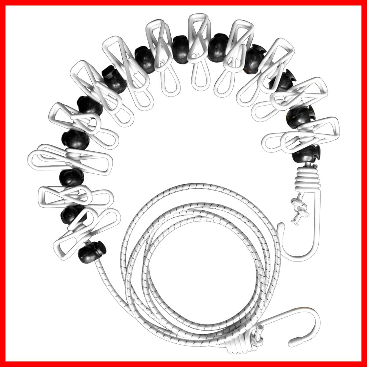 【商品詳細】長さ:1.8m(最大2.8m程度まで伸縮可能)。重量:180g。洗濯クリップ:12個。固定ストッパー:13個。素材:ゴム、鉄、ポリプロピレン、PVC。製造国:中国。