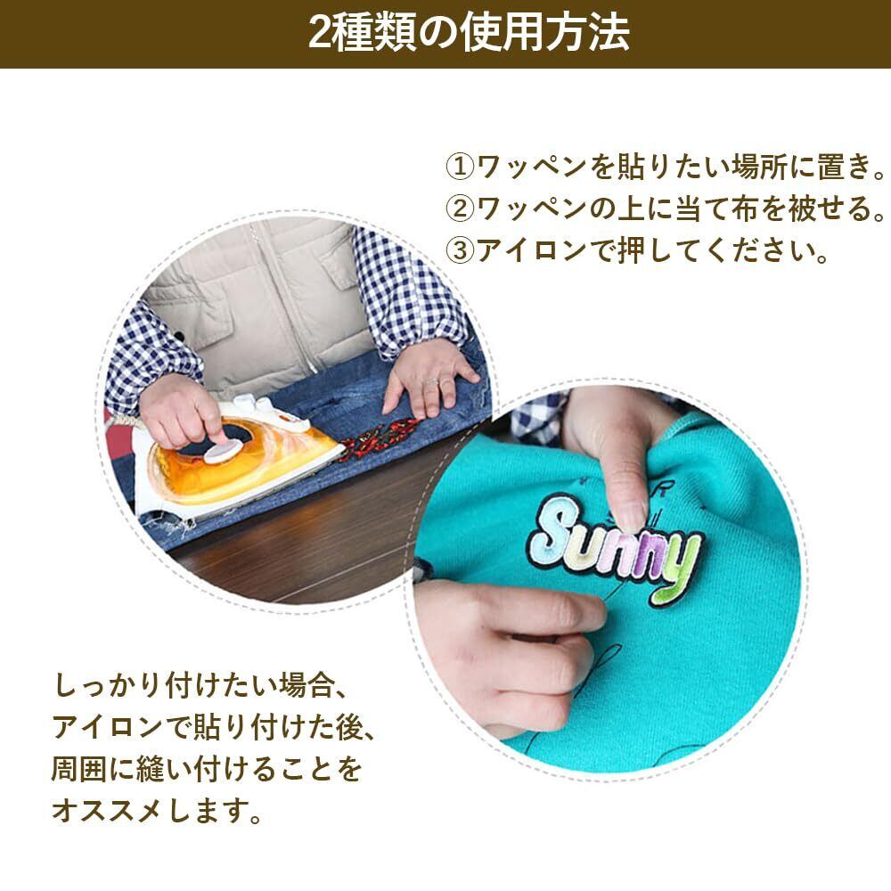 【2つの利用法】このバッジ布貼り装飾は、縫い付けることもアイロンで貼り付けることもできる2つの利用法を採用しています。ワッペンを貼り付けたいところに置いて、ワッペンの上に当て布を被せます。アイロンを加熱して真上から15秒間ぐらいワッペンを押さえてプレスしてください。イロン温度:ドライ中温(150℃~160℃)